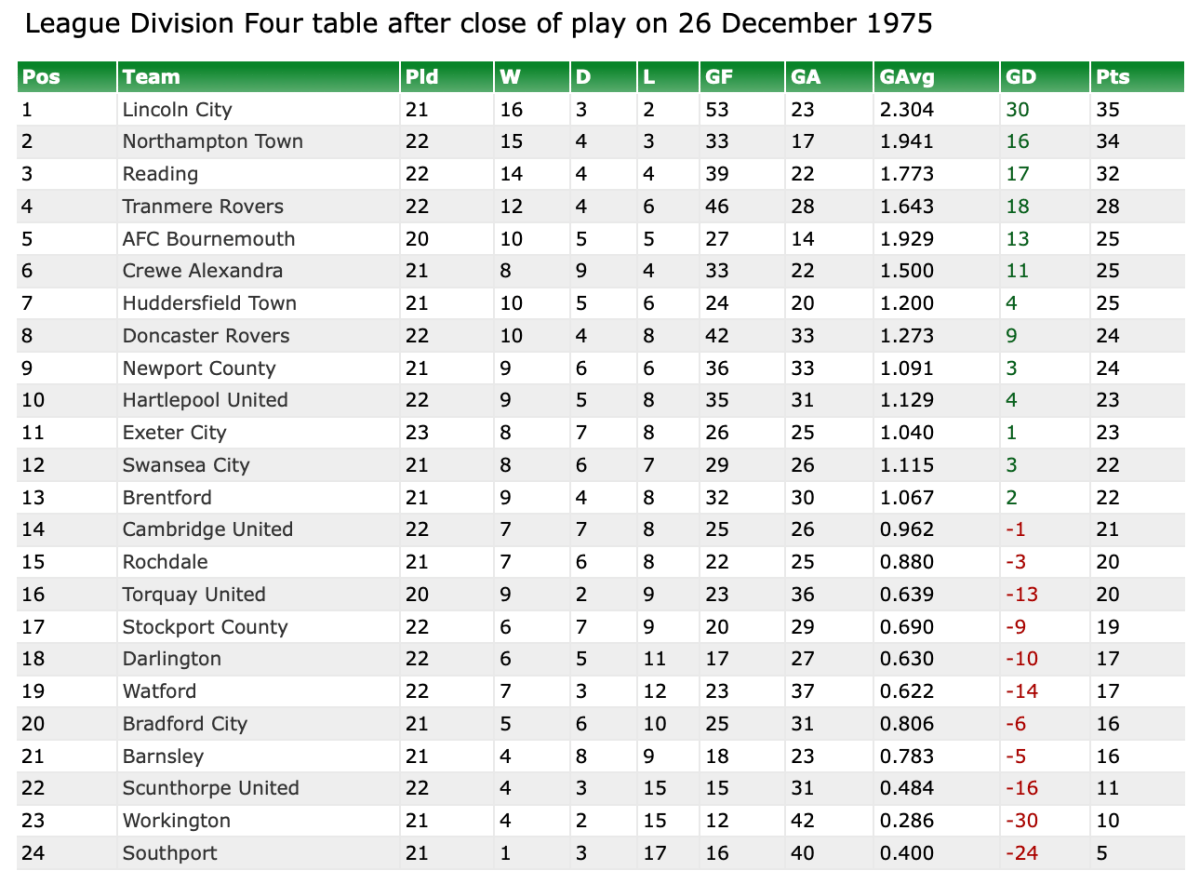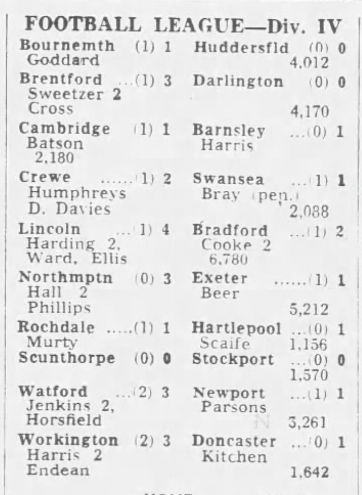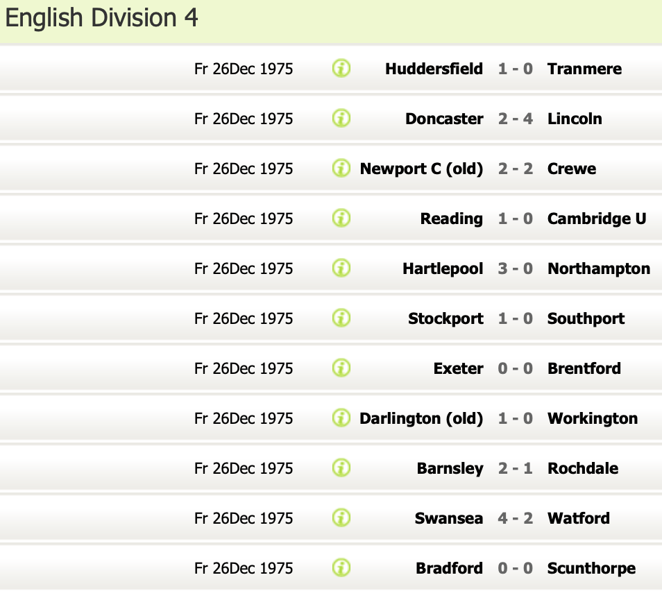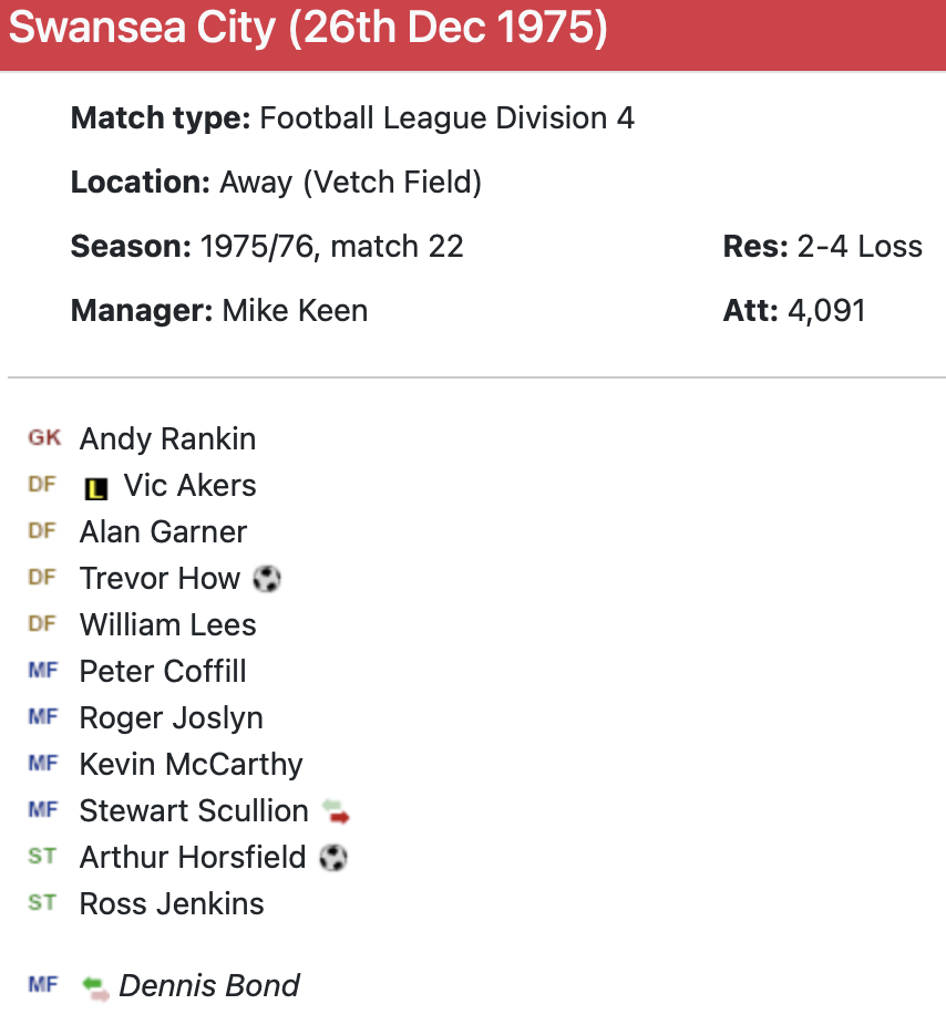 26th December 1975- Division Four, Swansea City 4 Watford 2 https://watford.fcdb.info/index.php?page=matches Watford Observer match report https://www.soccerbase.com/matches/results.sd?date=1975-12-26 https://www.11v11.com/league-tables/league-division-four/26-december-1975/ Share this: Share on X (Opens in new window) X Share on Facebook (Opens in new window) Facebook