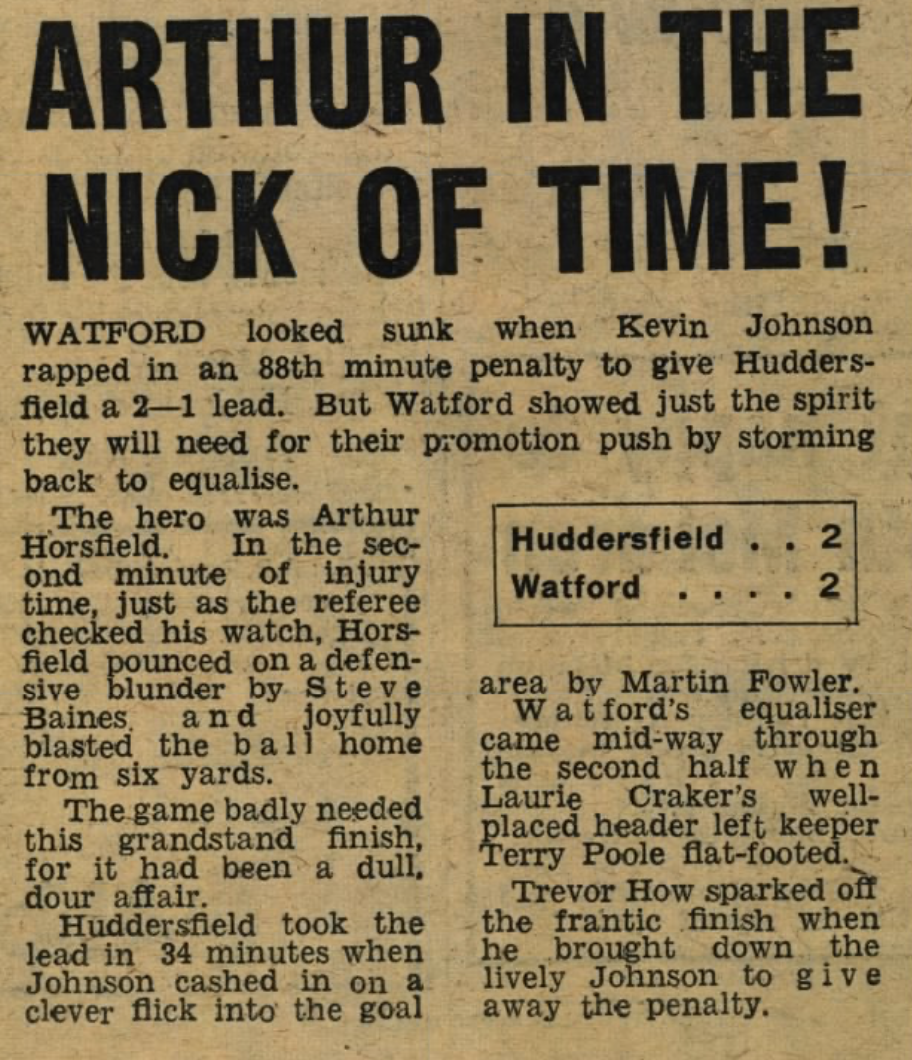 26th October 1976- Division Four, Huddersfield Town 2 Watford 2 http://watford.fcdb.info/index.php?page=matches Daily Mirror, 27 Oct 1976 Huddersfield Daily Exaimner, 27 oct 1976 Watford Observer match report https://www.soccerbase.com/matches/results.sd?date=1976-10-26 https://www.11v11.com/league-tables/league-division-four/26-october-1976/ Share this: Share on X (Opens in new window) X Share on Facebook (Opens in new window) Facebook