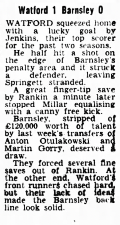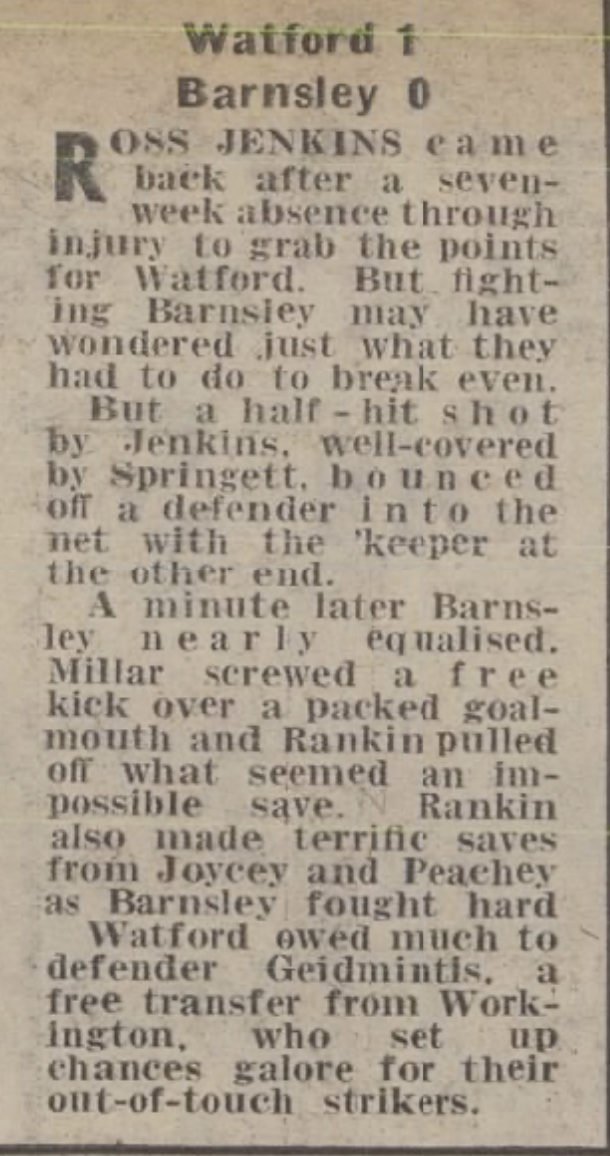 30th October 1976- Division Four, Watford 1 Barnsley 0 Leave a Reply http://watford.fcdb.info?s=34652&id=3143 Sunday Mirror, 31 Oct 1976 Sunday People, 31 Oct 1976 Share this: Share on X (Opens in new window) X Share on Facebook (Opens in new window) Facebook