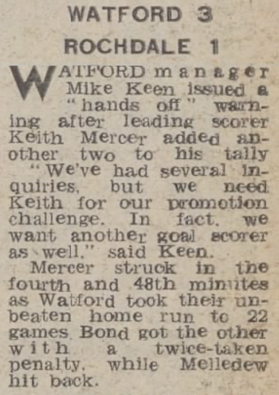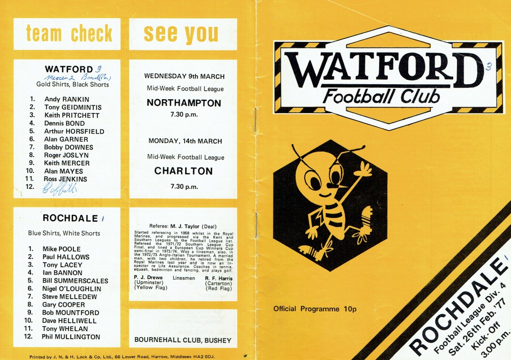 26th February 1977- Division Four, Watford 3 Rochdale 1 Leave a Reply https://watford.fcdb.info/index.php?page=matches Sunday Mirror, 27 Feb 1977 Watford Observer match report Share this: Share on X (Opens in new window) X Share on Facebook (Opens in new window) Facebook