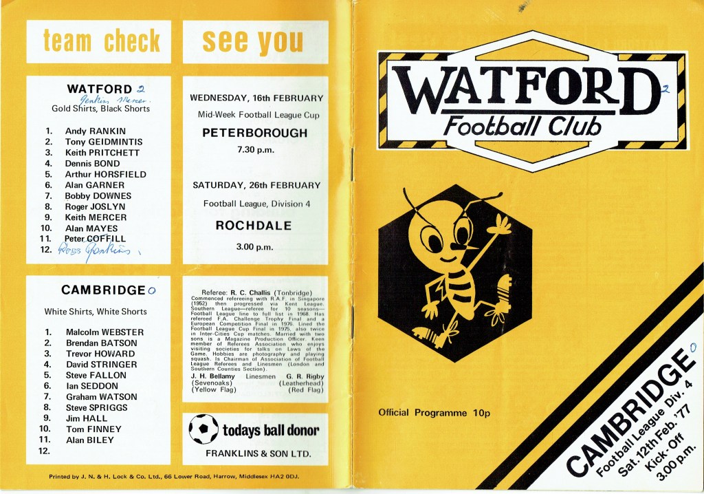 12th February 1977- Division Four, Watford 2 Cambridge United 0 Leave a Reply https://watford.fcdb.info/index.php?page=matches Sunday Mirror, 13 Feb 1977 Sunday People, 13 Feb 1977 Watford Observer match report Share this: Share on X (Opens in new window) X Share on Facebook (Opens in new window) Facebook
