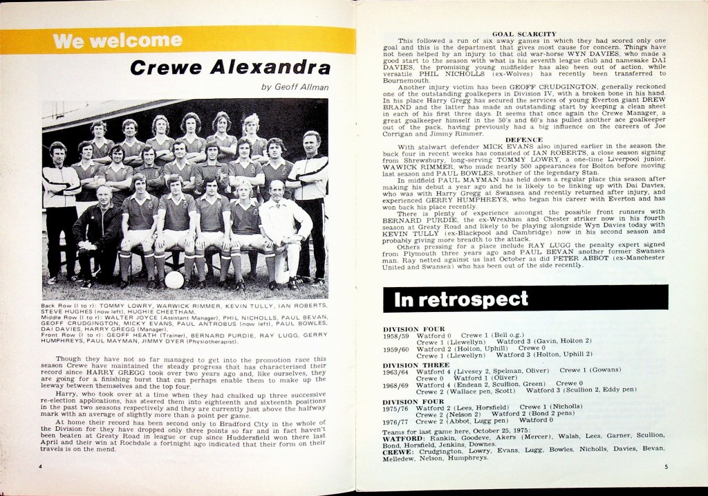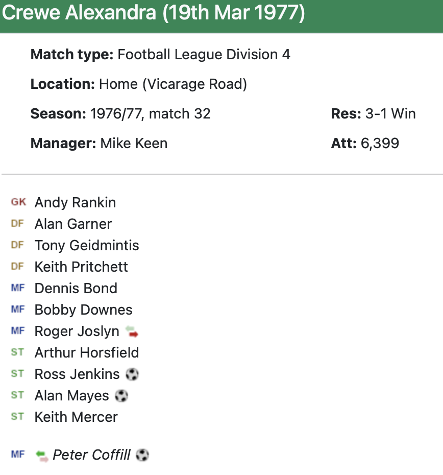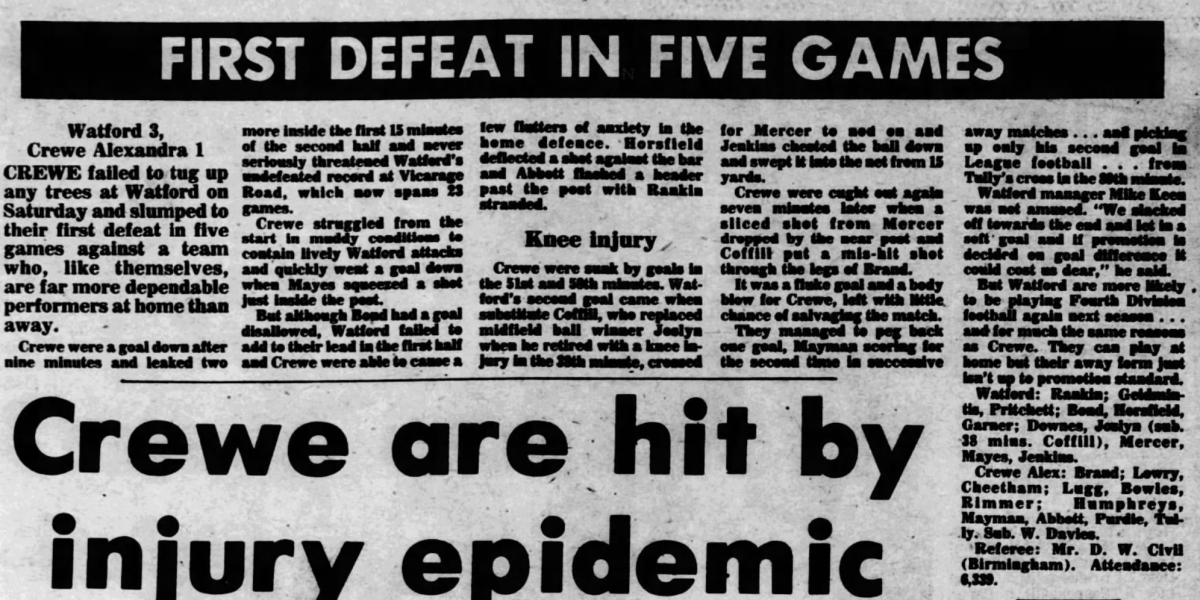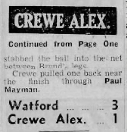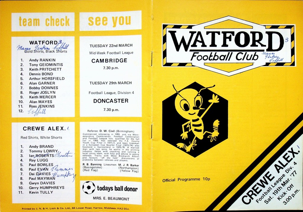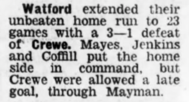 19th March 1977- Division Four, Watford 3 Crewe Alexandra 1 Leave a Reply https://watford.fcdb.info/index.php?page=matches Evening Sentinel, 19 Mar 1977 Sunday People, 20 Mar 1977 (Cheshire) Chronicle, 24 Mar 1977 Watford Observer match report https://www.soccerbase.com/matches/results.sd?date=1977-03-19 https://www.11v11.com/league-tables/league-division-four/19-march-1977/ Share this: Share on X (Opens in new window) X Share on Facebook (Opens in new window) Facebook
