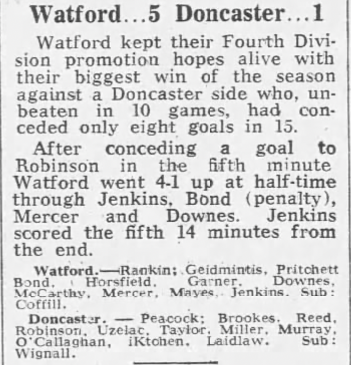 29th March 1977- Division Four, Watford 5 Doncaster Rovers 1 Leave a Reply http://watford.fcdb.info?id=3168 Daily Telegraph, 30 Mar 1977 Watford Observer match report Share this: Share on X (Opens in new window) X Share on Facebook (Opens in new window) Facebook