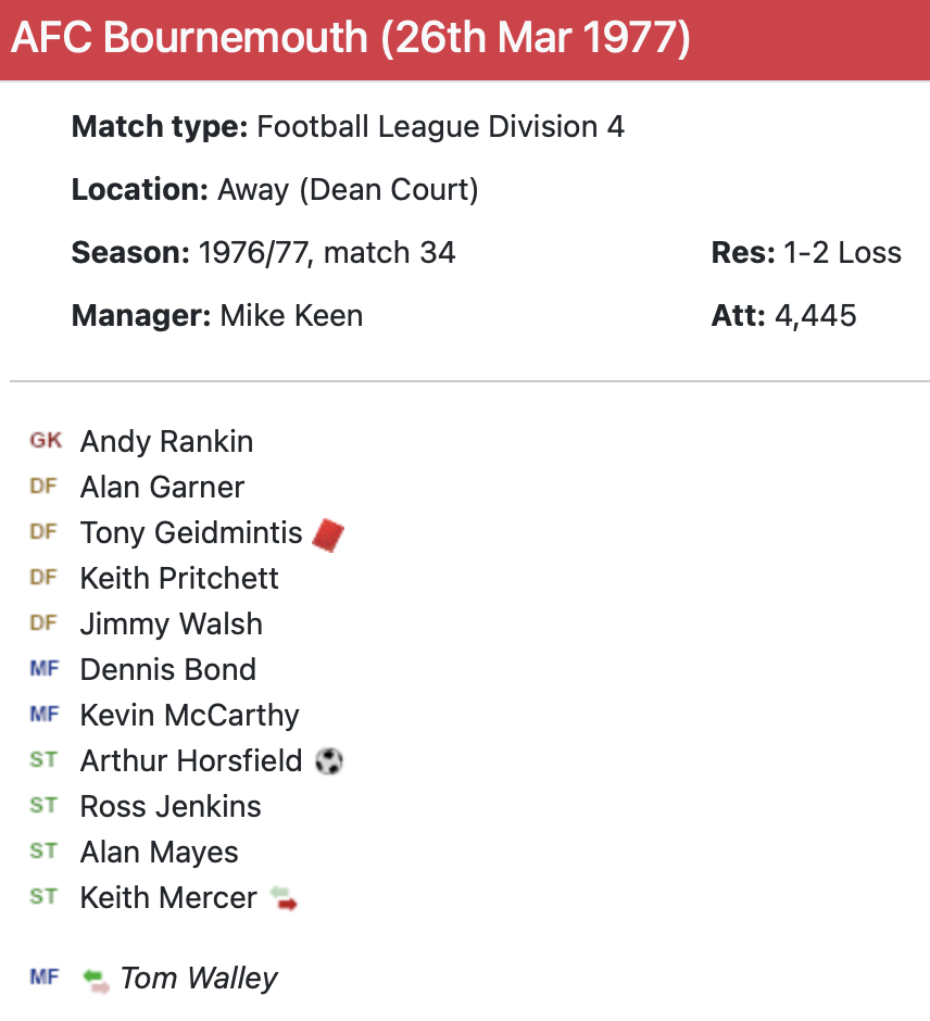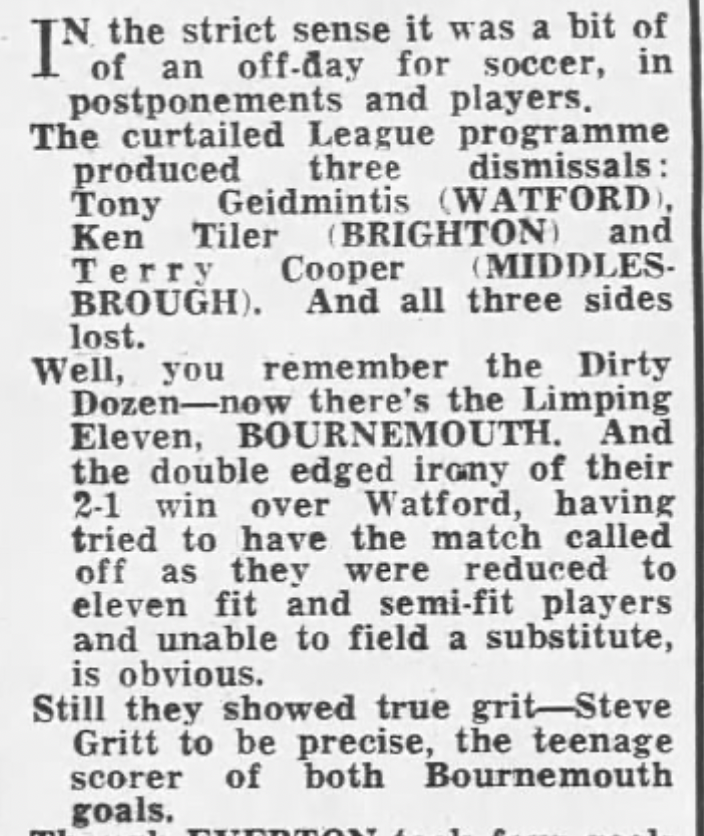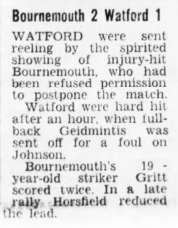 26th March 1977- Division Four, AFC Bournemouth 2 Watford 1 Daily Telegraph, 26 Mar 1977 Sunday People, 27 Mar 1977 Sunday Telegraph, 27 Mar 1977 Watford Observer match report Sunday People, 27 Mar 1977 Share this: Share on X (Opens in new window) X Share on Facebook (Opens in new window) Facebook
