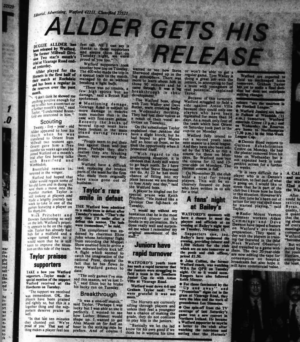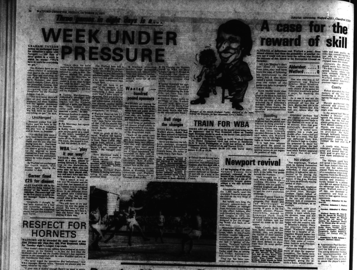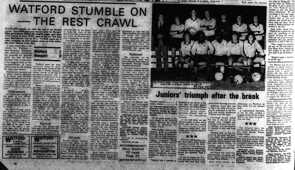 Gary Plumley, the son of our future Chief Executive Eddie Plumley, was in goal for Newport County. In 1987 he would play one game for Watford, an FA Cup semi-final against Spurs due to injuries to goalkeepers Tony Coton and Steve Sherwood.