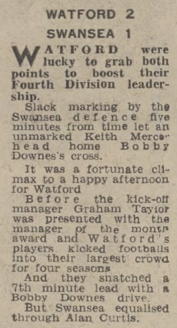 8th October 1977- Division Four, Watford 2 Swansea City 1 Leave a Reply http://watford.fcdb.info?id=3195 Sunday Mirror, 9 Oct 1977 Sunday People, 9 Oct 1977 Watford Observer match report Sunday People Share this: Share on X (Opens in new window) X Share on Facebook (Opens in new window) Facebook
