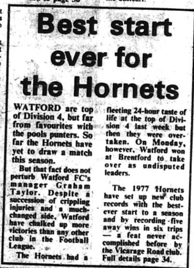 1st October 1977- Division Four, Rochdale 2 Watford 3 http://watford.fcdb.info/index.php?page=matches Sunday People, 2 Oct 1977 Watford Observer match report https://www.soccerbase.com/matches/results.sd?date=1977-10-01 https://www.11v11.com/league-tables/league-division-four/01-october-1977/ Share this: Share on X (Opens in new window) X Share on Facebook (Opens in new window) Facebook