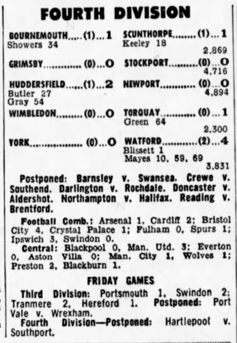 13th January 1978- Division Four, Watford 1 Stockport County 0 Leave a Reply http://watford.fcdb.info/index.php?page=matches Daily Telegraph, 14 Jan 1978 Daily Mirror, 13 Jan 1978 Watford Observer match report https://www.soccerbase.com/matches/results.sd?date=1978-01-13 https://www.11v11.com/league-tables/league-division-four/13-january-1978/ Share this: Share on X (Opens in new window) X Share on Facebook (Opens in new window) Facebook