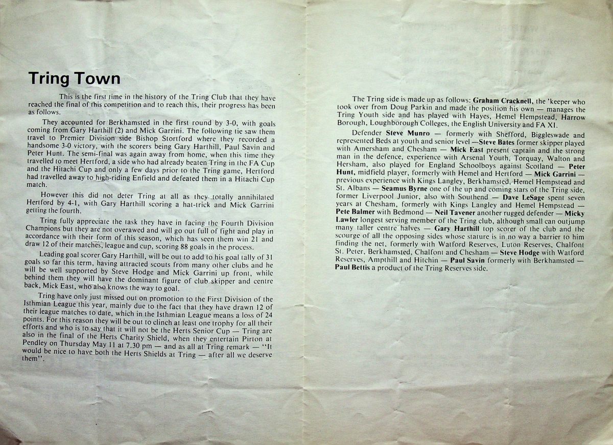 8th May 1978- Herts Senior Cup Final, Watford 2 Tring Town 1 Programme images courtesy of Matt Hall https://www.watfordfcarchive.co.uk/fixture/1978-05-08 Watford Observer match report Share this: Share on X (Opens in new window) X Share on Facebook (Opens in new window) Facebook