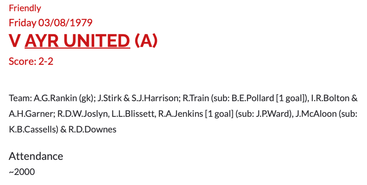 3rd August 1979- Friendly, Ayr United 2 Watford 2 https://www.watfordfcarchive.co.uk/fixture/1979-08-03 Watford Observer match report Share this: Share on X (Opens in new window) X Share on Facebook (Opens in new window) Facebook