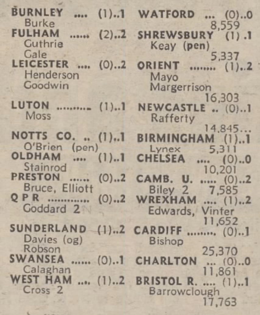 29th December 1979- Division Two, Watford 0 Cambridge United 0 Leave a Reply https://www.soccerbase.com/matches/results.sd?date=1979-12-29 https://www.11v11.com/league-tables/league-division-two/29-december-1979/ More games from 29th December at https://oldwatford.com/tag/dec29 Share this: Share on X (Opens in new window) X Share on Facebook (Opens in new window) Facebook