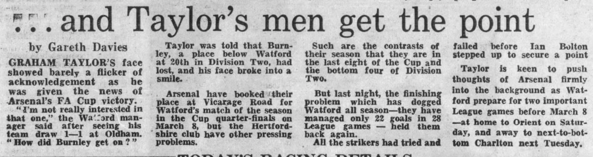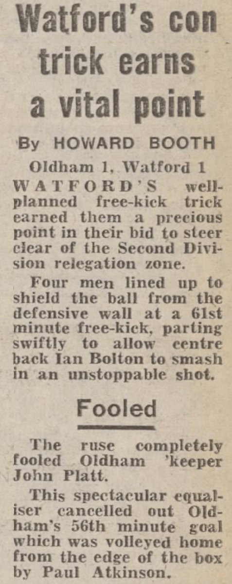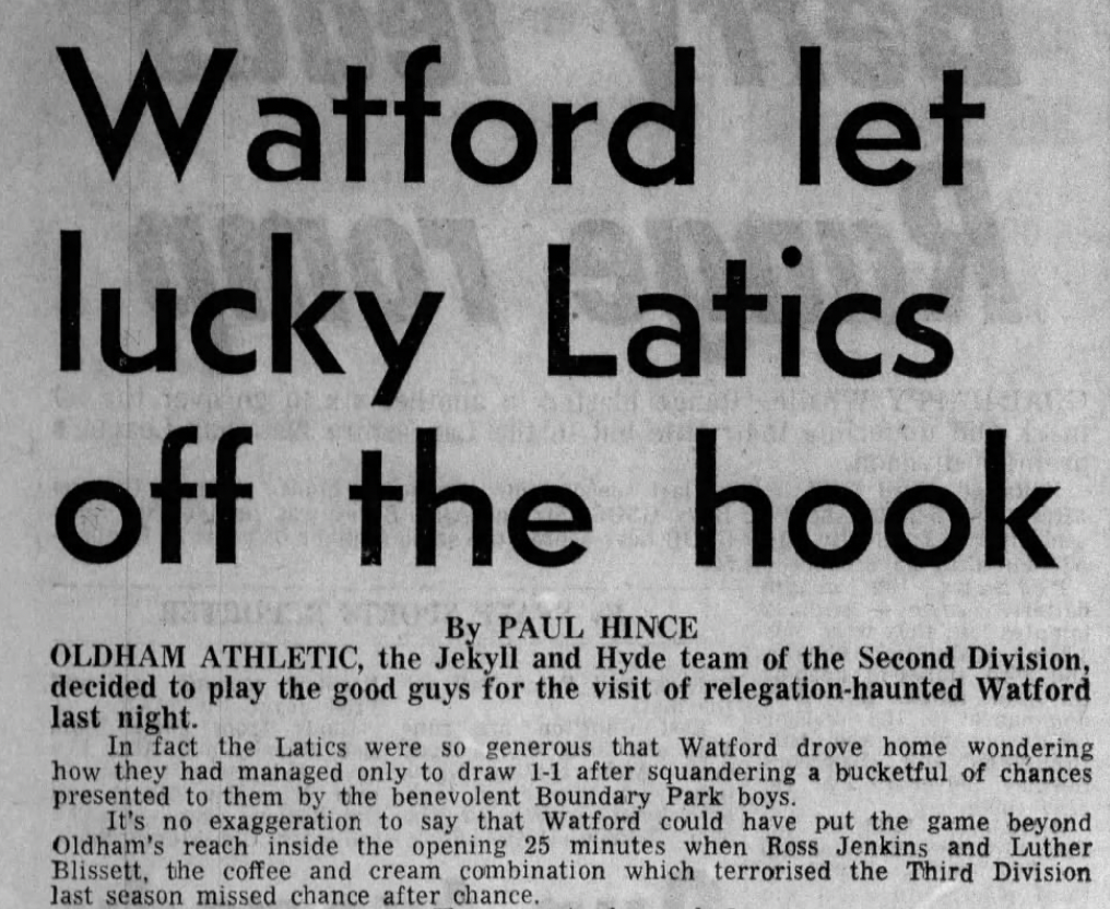 19th February 1980- Division Two, Oldham Athletic 1 Watford 1 The game was postponed from New Year’s Day. https://watford.fcdb.info/index.php?page=matches Watford Observer match report Daily Mirror, 20 Feb 1980 Evening Standard, 20 Feb 1980 https://www.soccerbase.com/matches/results.sd?date=1980-02-19 https://www.11v11.com/league-tables/league-division-two/19-february-1980/#google_vignette Share this: Share on X (Opens in new window) X Share on Facebook (Opens in new window) Facebook