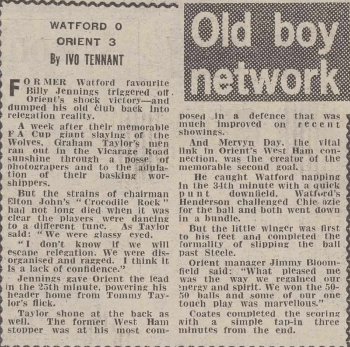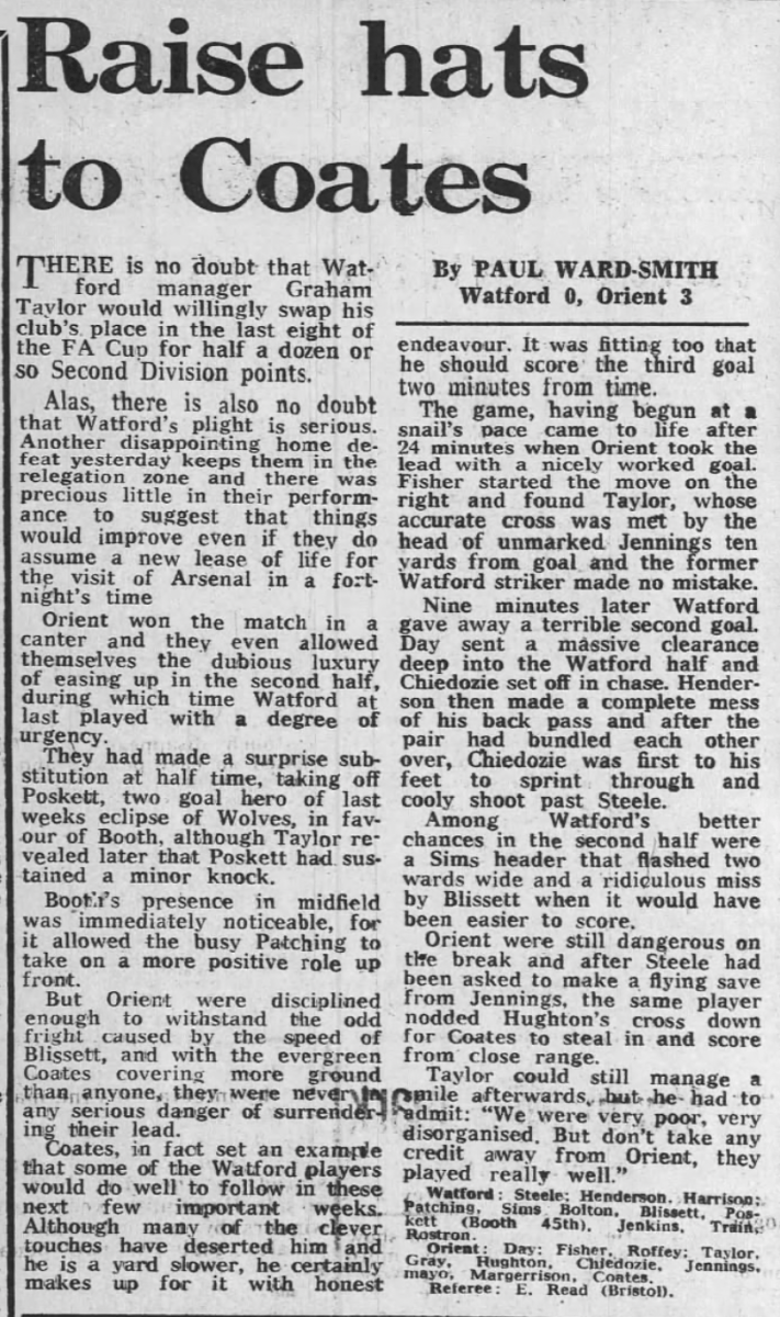 23rd February 1980-Division Two, Watford 0 Orient 3 Leave a Reply https://watford.fcdb.info/index.php?page=matches Watford Observer match report Sunday Telegraph, 24 Feb 1980 Sunday Mirror, 24 Feb 1980 Share this: Share on X (Opens in new window) X Share on Facebook (Opens in new window) Facebook