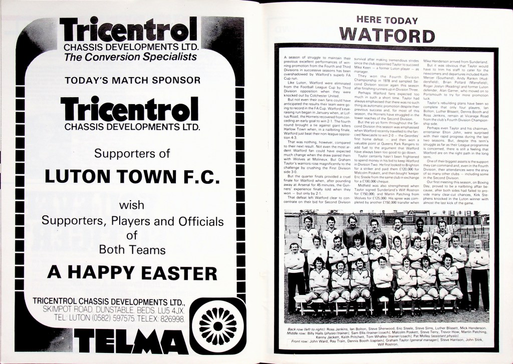 5th April 1980- Division Two, Luton Town 1 Watford 0 Leave a Reply http://watford.fcdb.info?id=3333 Watford Observer match report Sunday Mirror, 6 Apr 1980 Sunday People, 6 Apr 1980 https://www.soccerbase.com/matches/results.sd?date=1980-04-05 https://www.11v11.com/league-tables/league-division-two/05-april-1980/ Share this: Share on X (Opens in new window) X Share on Facebook (Opens in new window) Facebook