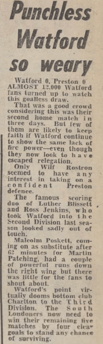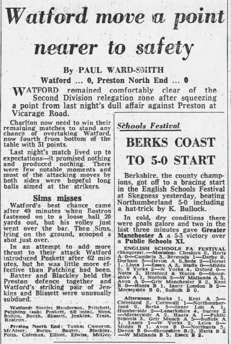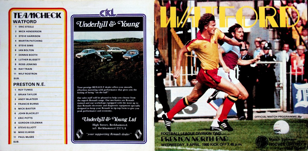 9th April 1980- Division Two, Watford 0 Preston North End 0 Leave a Reply http://watford.fcdb.info?id=3335 Watford Observer match report Daily Mirror, 10 Apr 1980 Daily Telegraph, 10 Apr 1980 https://www.soccerbase.com/matches/results.sd?date=1980-04-09 https://www.11v11.com/league-tables/league-division-two/09-april-1980/ Share this: Share on X (Opens in new window) X Share on Facebook (Opens in new window) Facebook