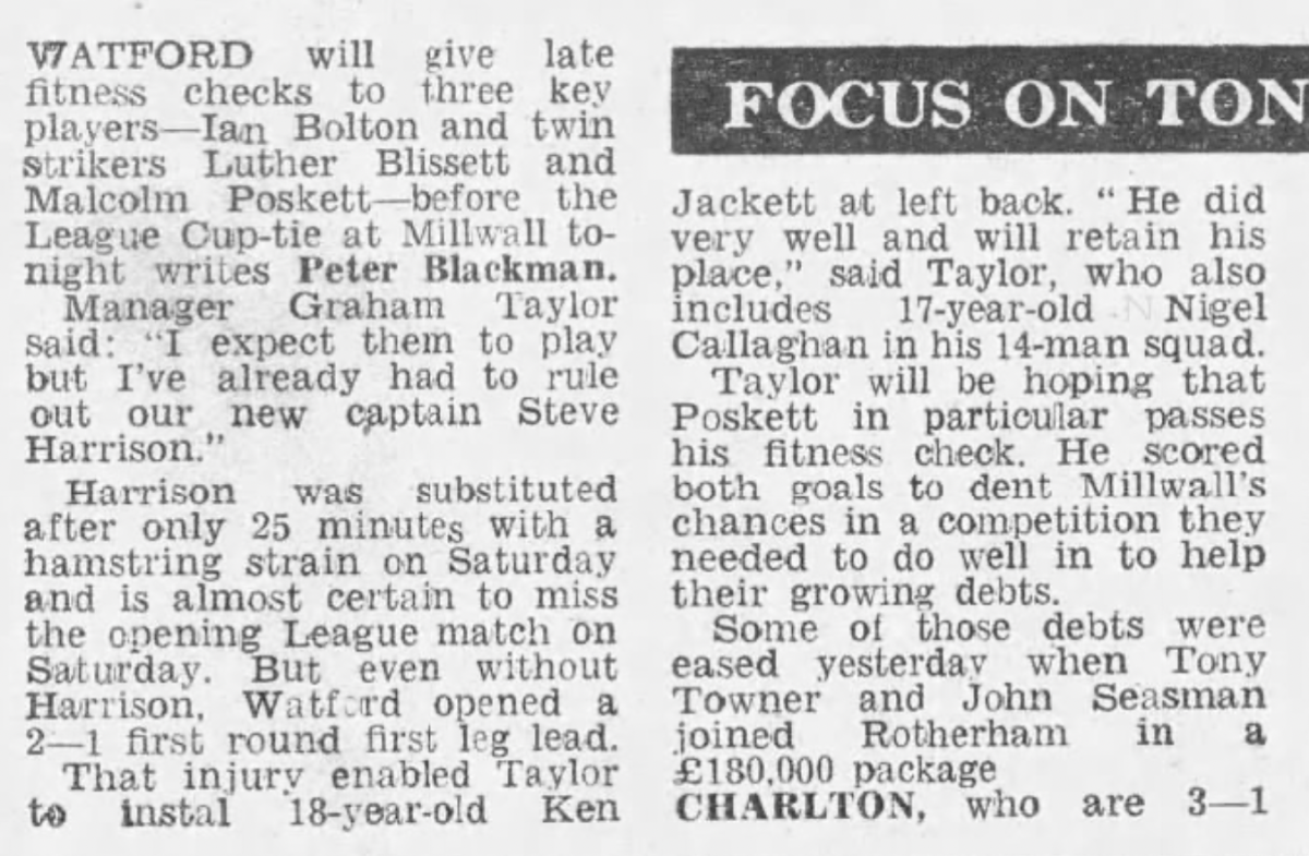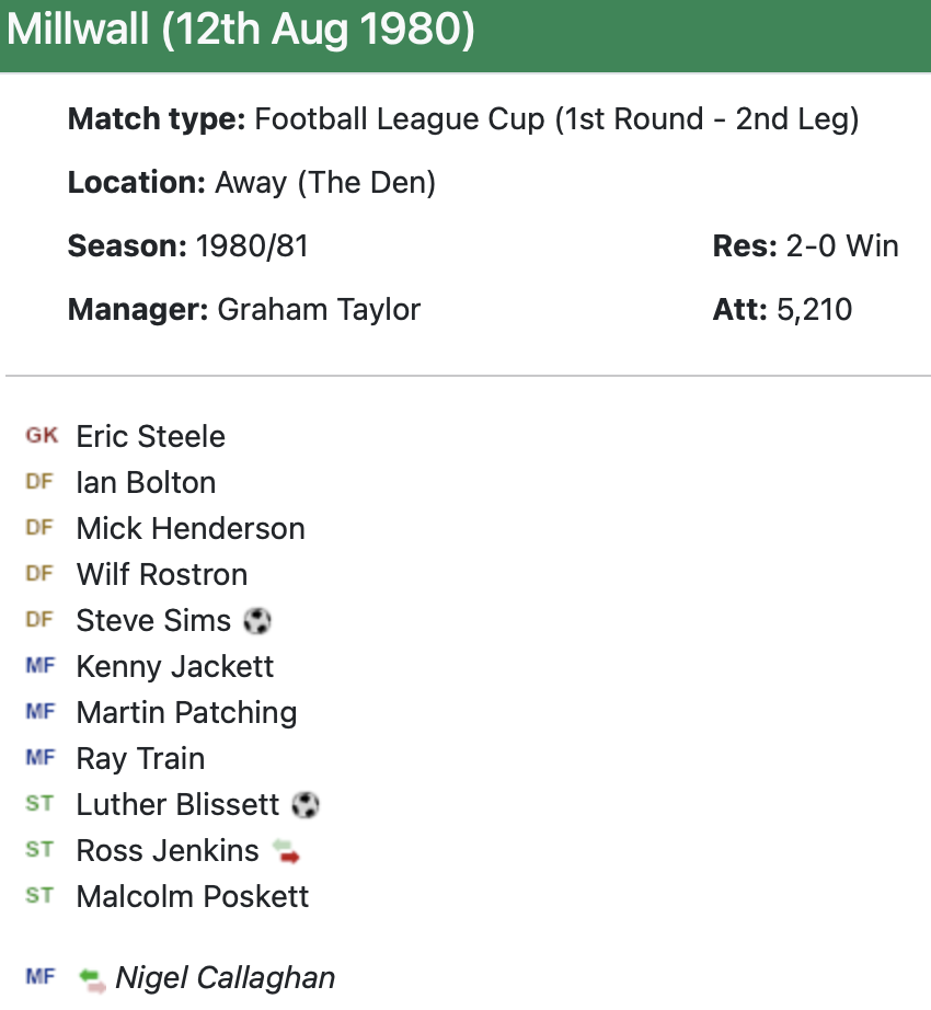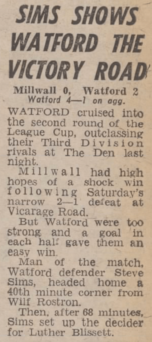 12th August 1980- League Cup First Round Second Leg, Millwall 0 Watford 2 (Watford win 4-1 on aggregate)