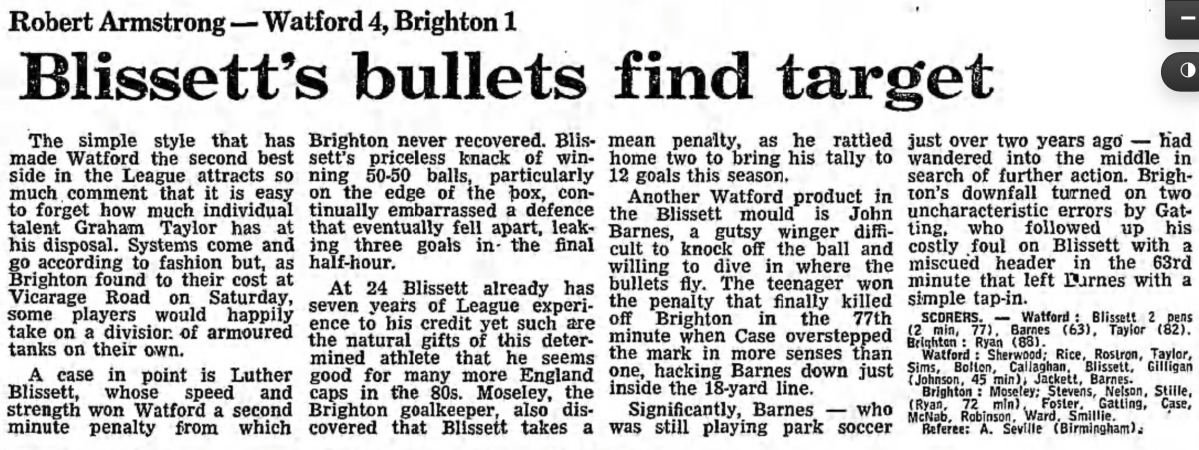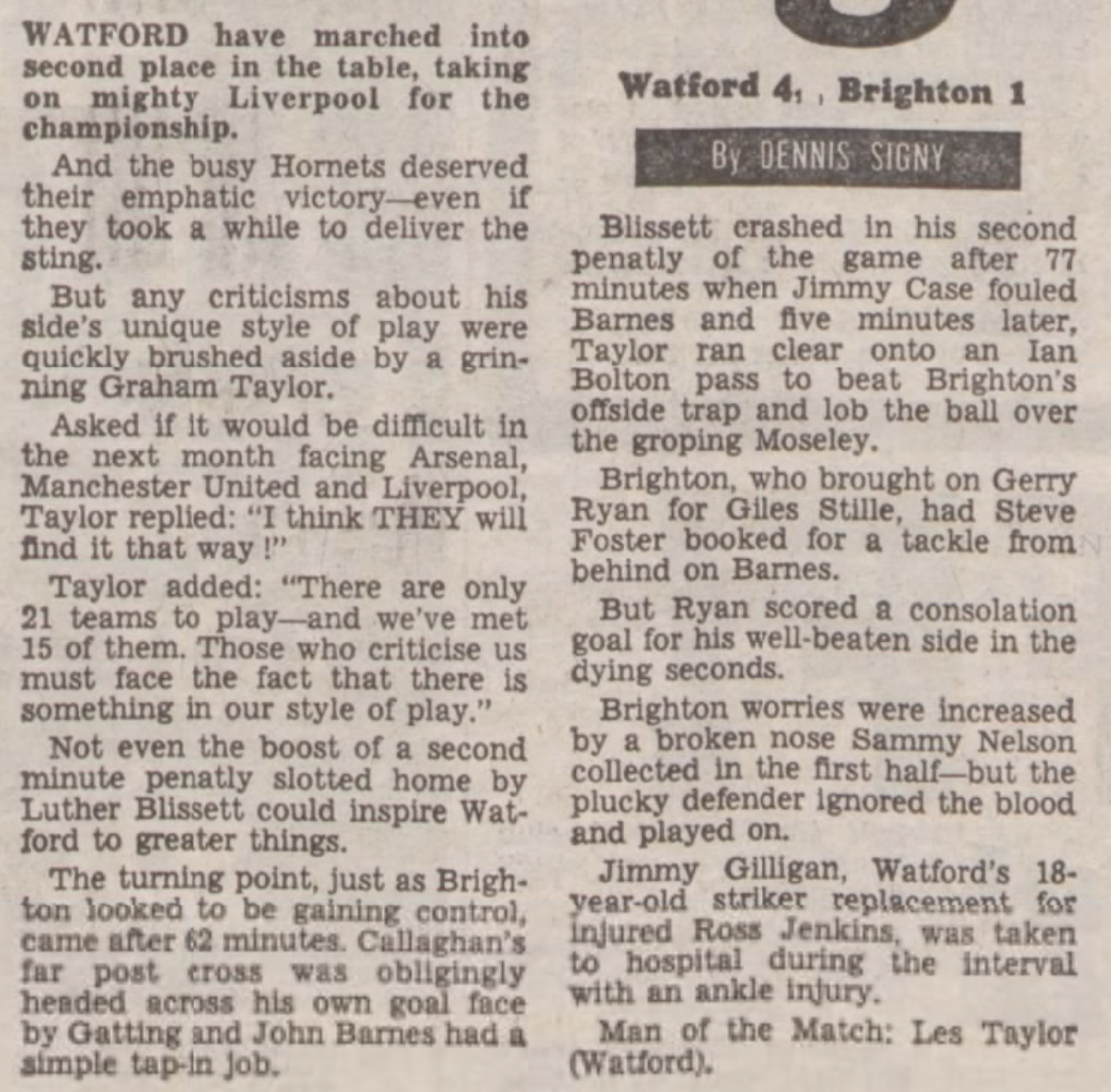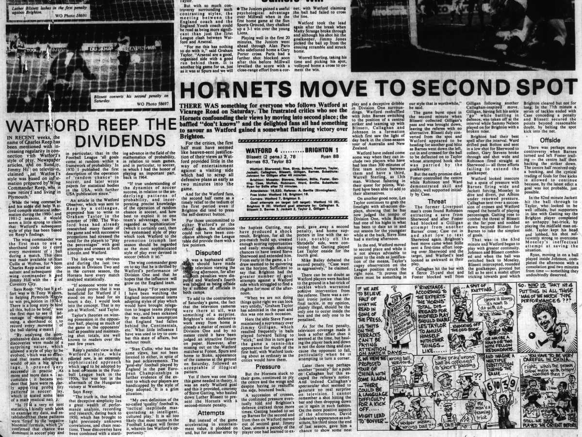 20th November 1982-Division One, Watford 4 Brighton & Hove Albion 1 Leave a Reply Sunday Mirror, 21 Nov 1982 Guardian, 22 Nov 1982 Watford Observer match report http://watford.fcdb.info?s=39599&id=3468 Share this: Click to share on X (Opens in new window) X Click to share on Facebook (Opens in new window) Facebook