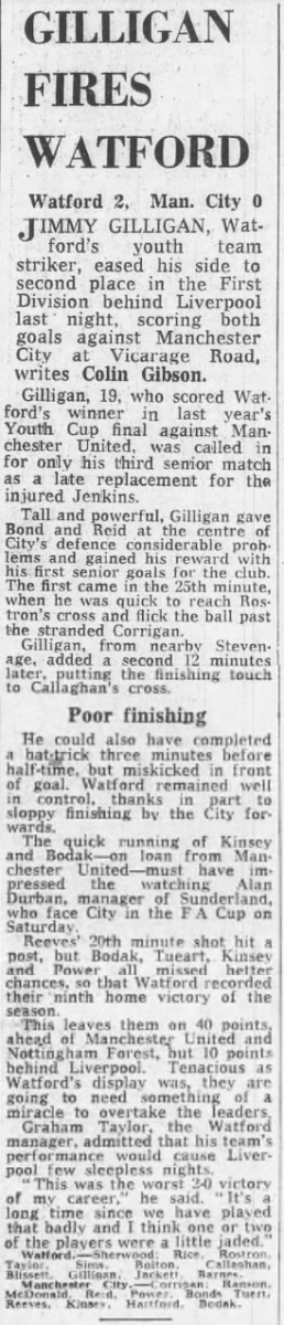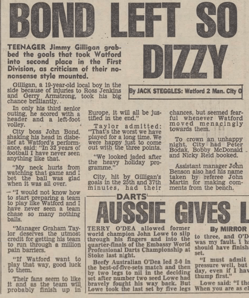 3rd January 1983-Division One, Watford 2 Manchester City 0 Leave a Reply http://watford.fcdb.info/index.php?page=matches Daily Telegraph, 3rd Jan 1983 Daily Mirror, 4 Jan 1983 Taken from the programme on 2nd February 2013-Championship, Watford 2 Bolton Wanderers 1 Share this: Share on X (Opens in new window) X Share on Facebook (Opens in new window) Facebook