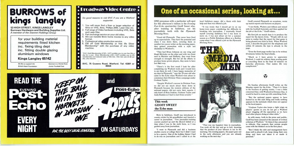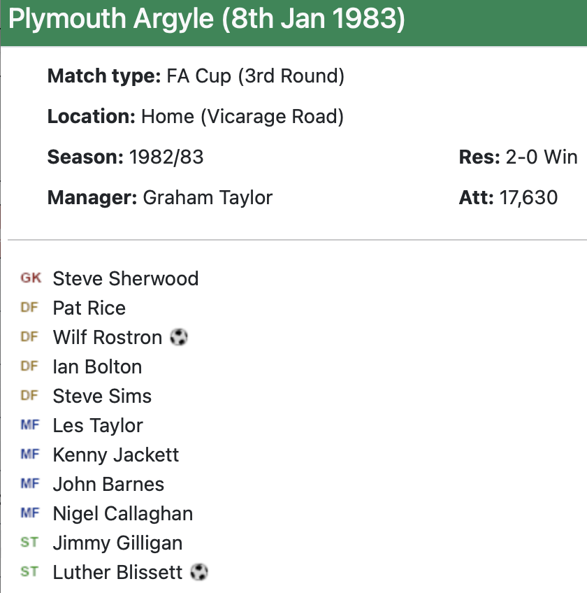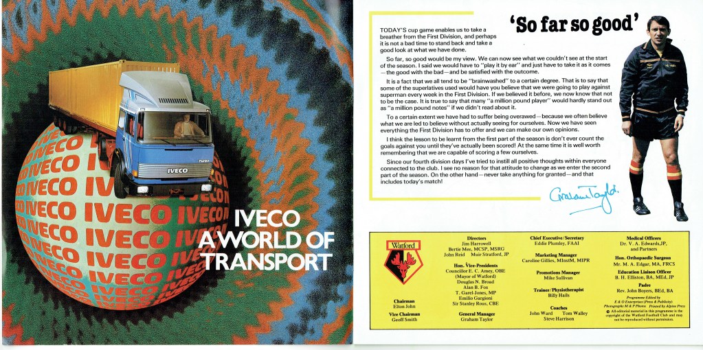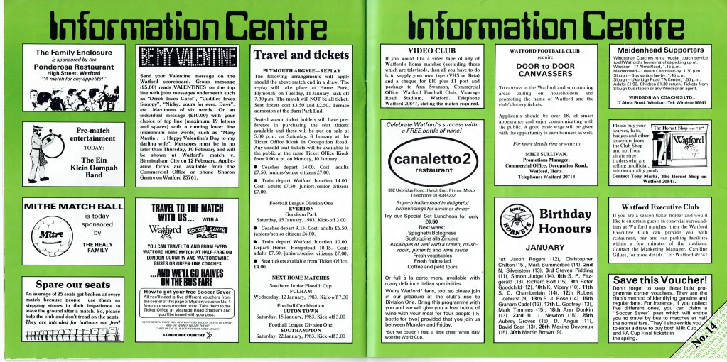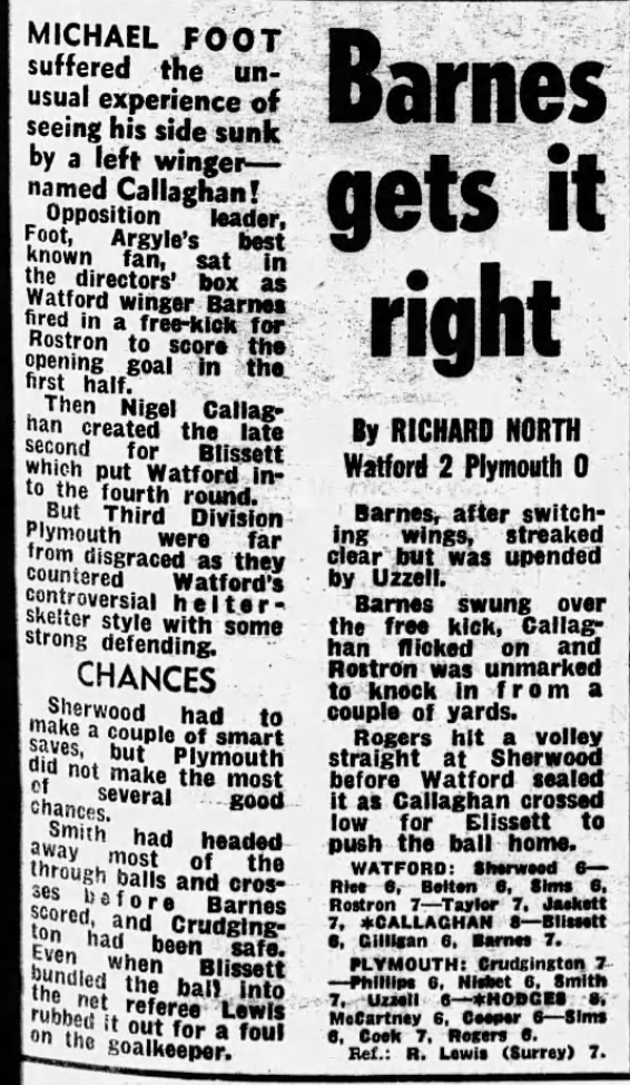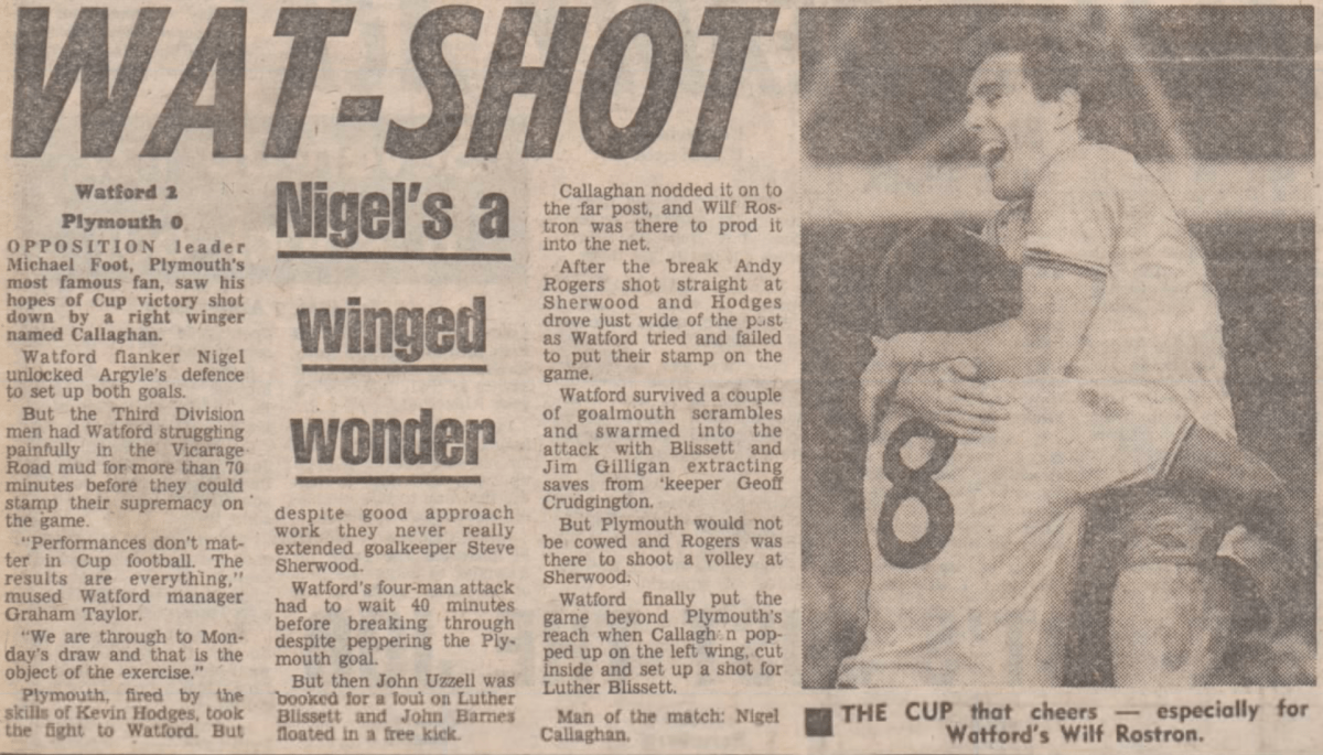 8th January 1983- FA Cup Third Round, Watford 2 Plymouth Argyle 0 Leave a Reply http://watford.fcdb.info/index.php?page=matches Sunday Mirror, 9 Jan 1983 Sunday People, 9 Jan 1983 Elton and Michael Foot, Sunday Telegraph, 9 Jan 1983 8th February 2013- Championship, Watford 2 Crystal Palace 2 Share this: Share on X (Opens in new window) X Share on Facebook (Opens in new window) Facebook