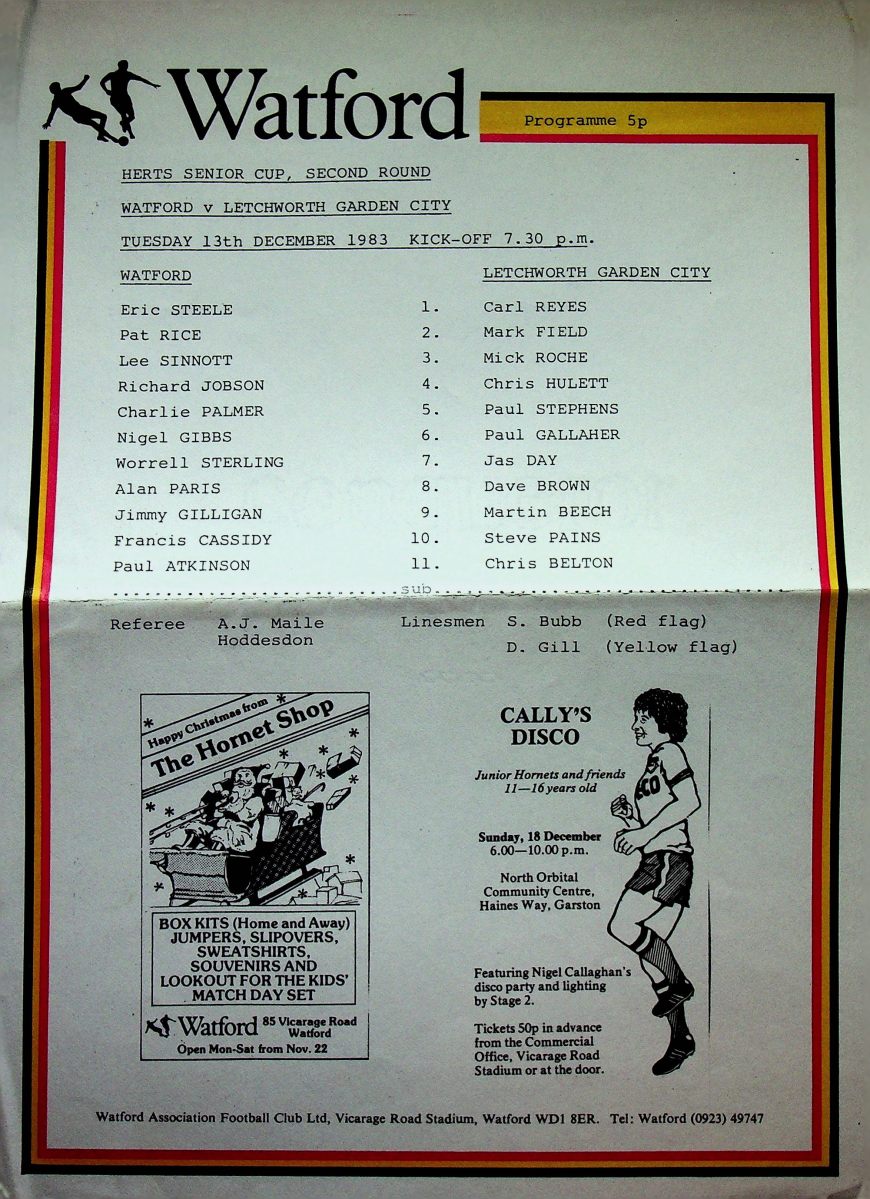 13th December 1983- Herts Senior Cup Second Round, Watford 2 Letchworth Garden City 0 Programme images courtesy of Matt Hall https://oldwatford.com/1983/12/31/31st-december-1983-division-one-watford-1-birmingham-city-0/ Share this: Click to share on X (Opens in new window) X Click to share on Facebook (Opens in new window) Facebook