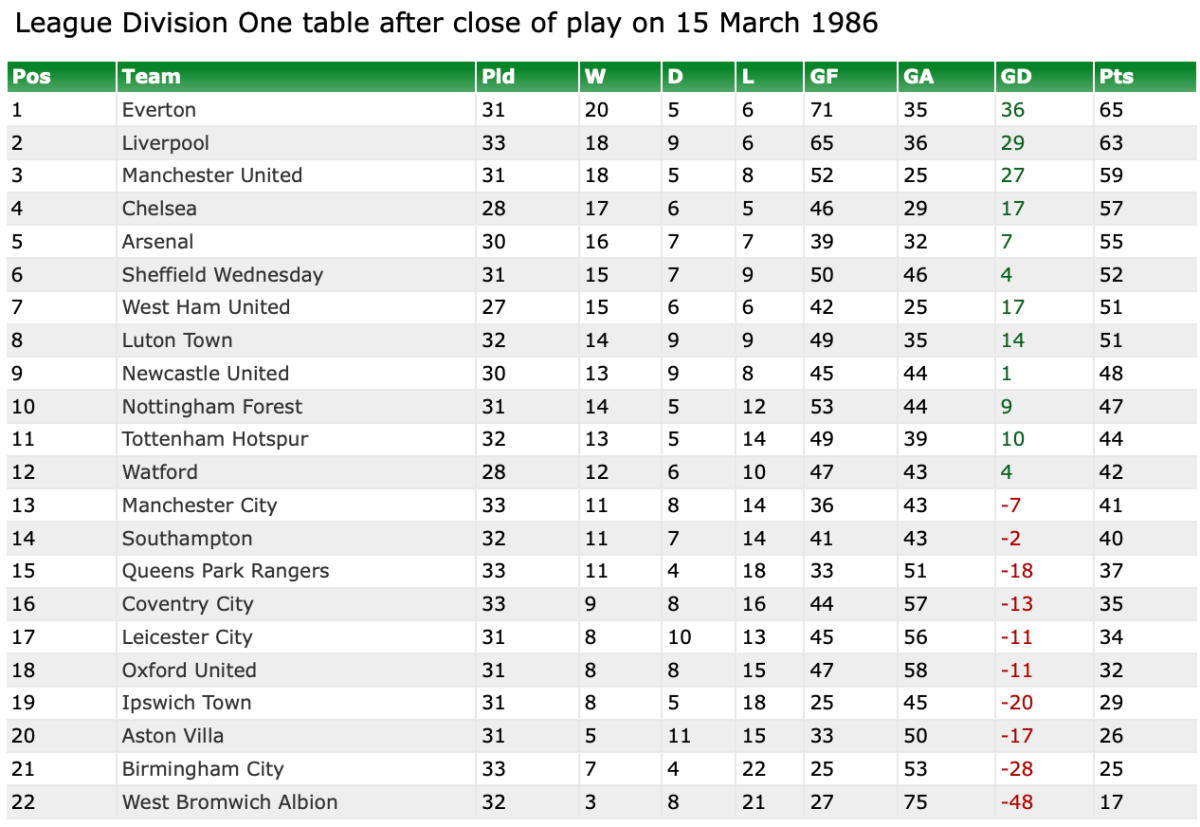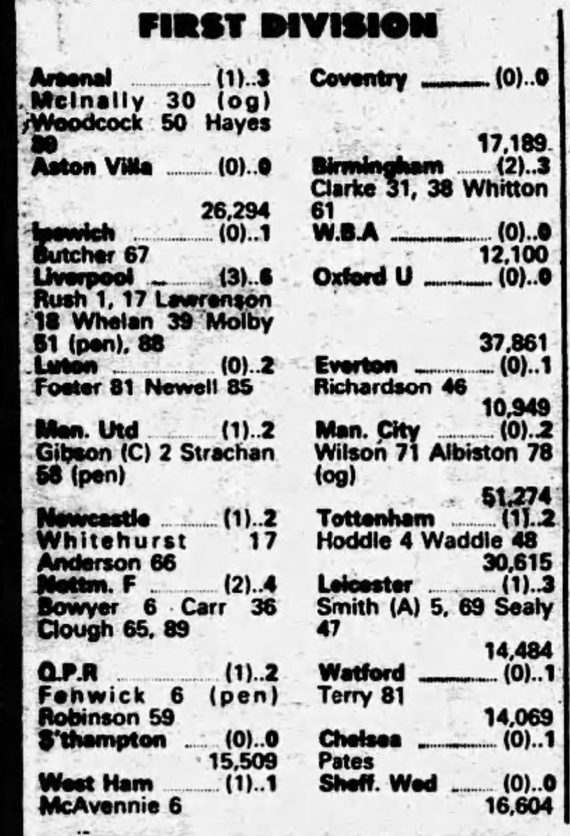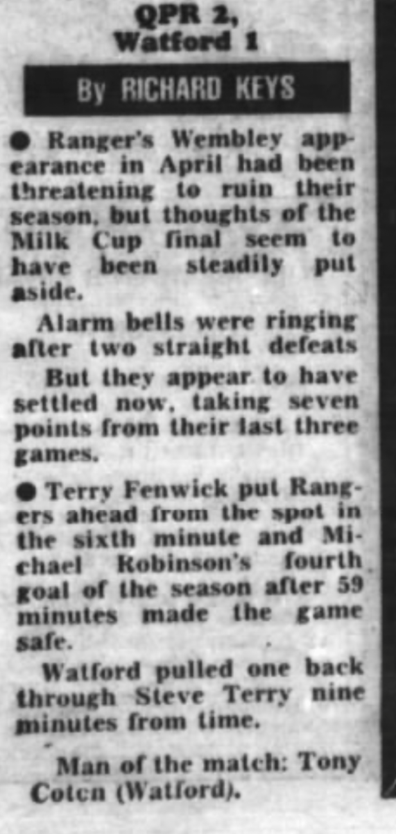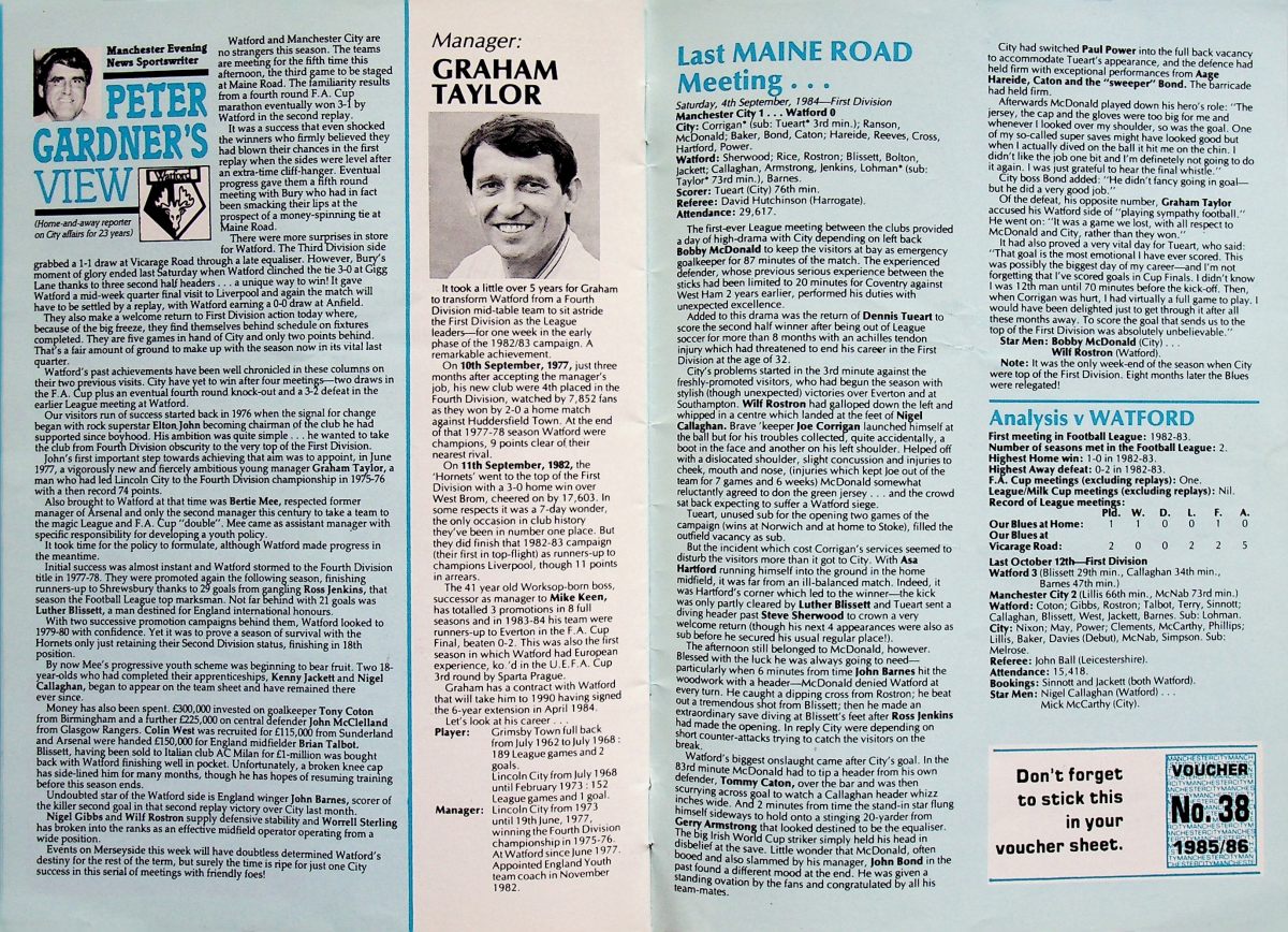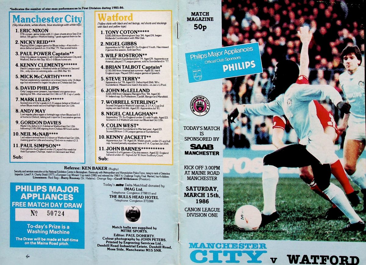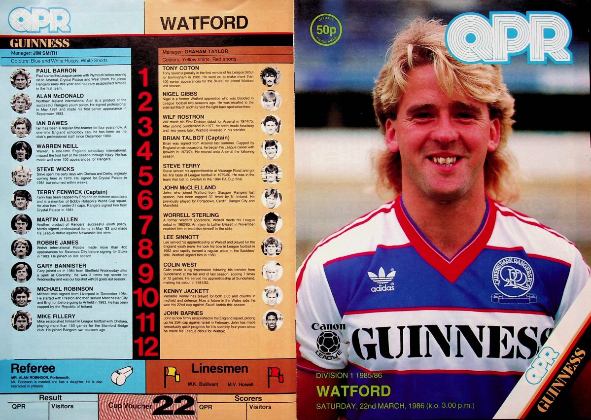 The first game of the double-header against Arsenal. This game was always scheduled to be played on Easter Monday but the fixture at Vicarage Road which should have been on Boxing Day 1985 was postponed twice and eventually rearranged for 1st April meaning the sides would face each other on consecutive days.