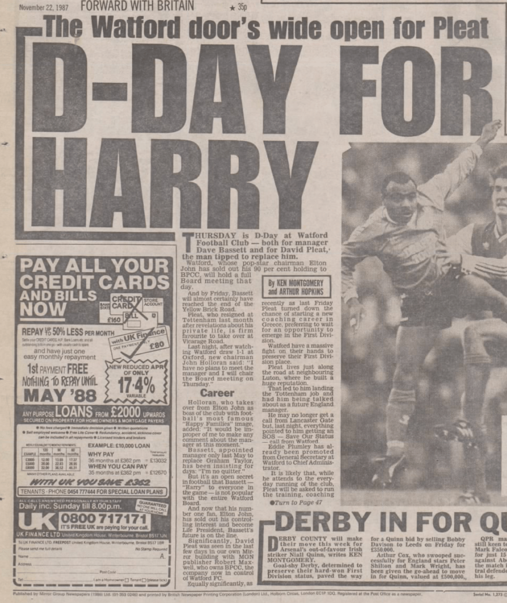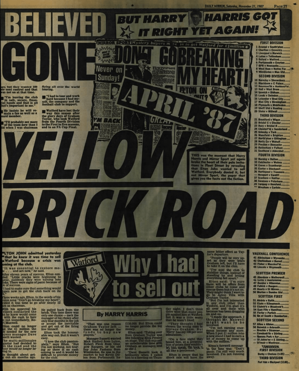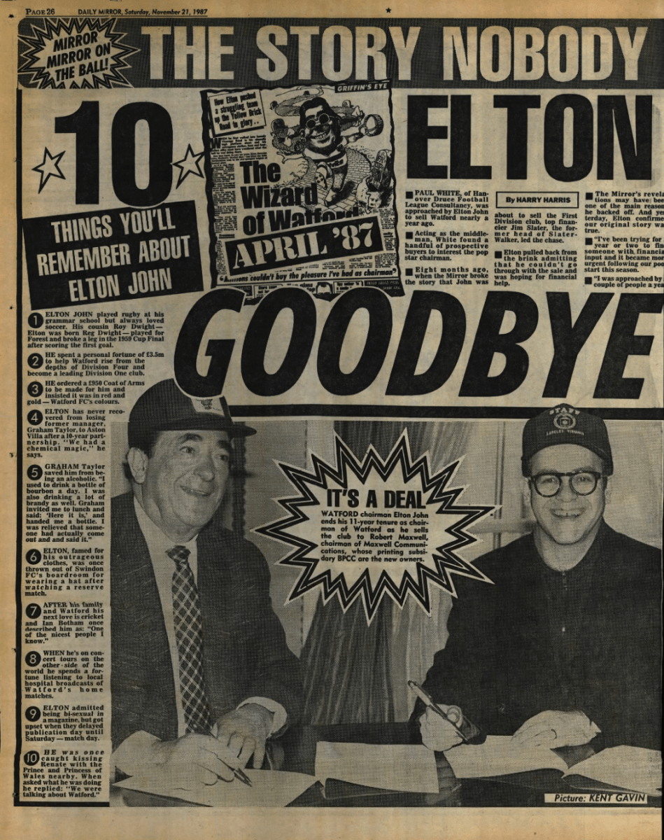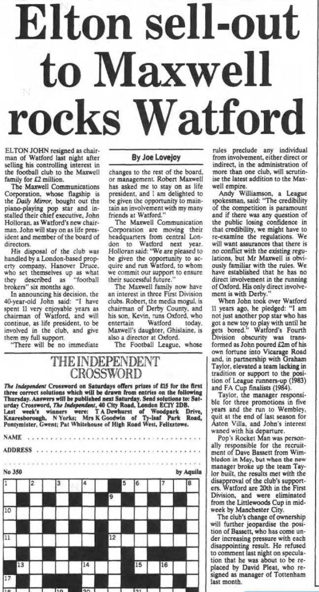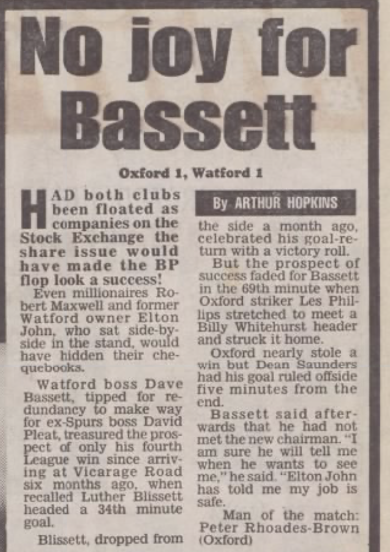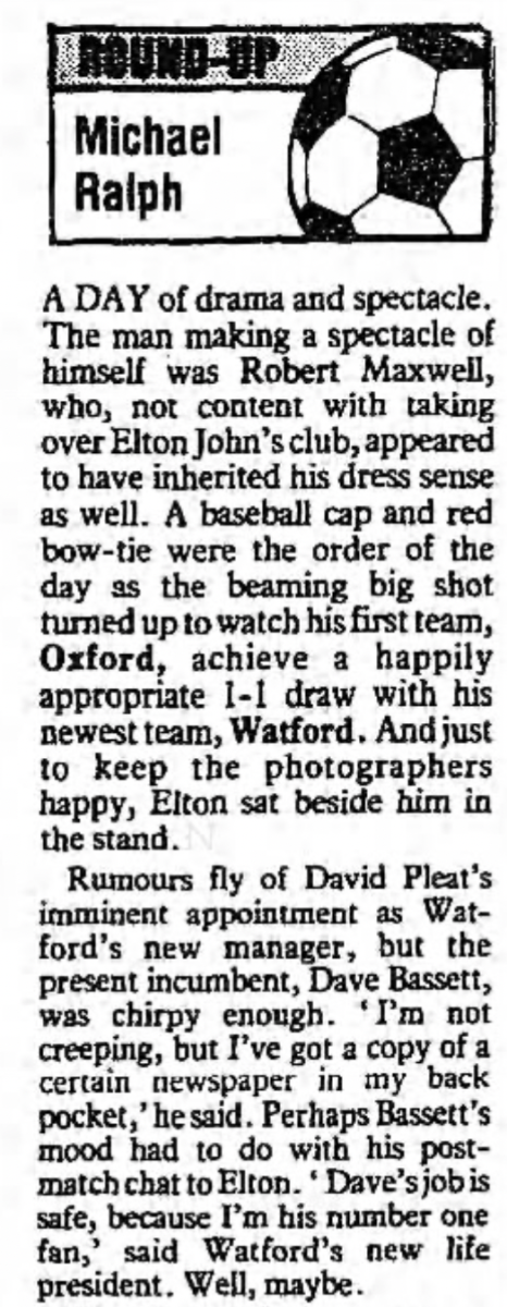 It’s pretty unthinkable that Watford being taken over would be a major news story but the media interest in both Elton and Robert Maxwell meant that the proposed sale of the club to Maxwell’s printing company BPCC was big news, particularly because he already owned Oxford United and Derby County. The fact that a deal appeared to be done just before we played Oxford only added to the interest. Eventually the deal would fall through.