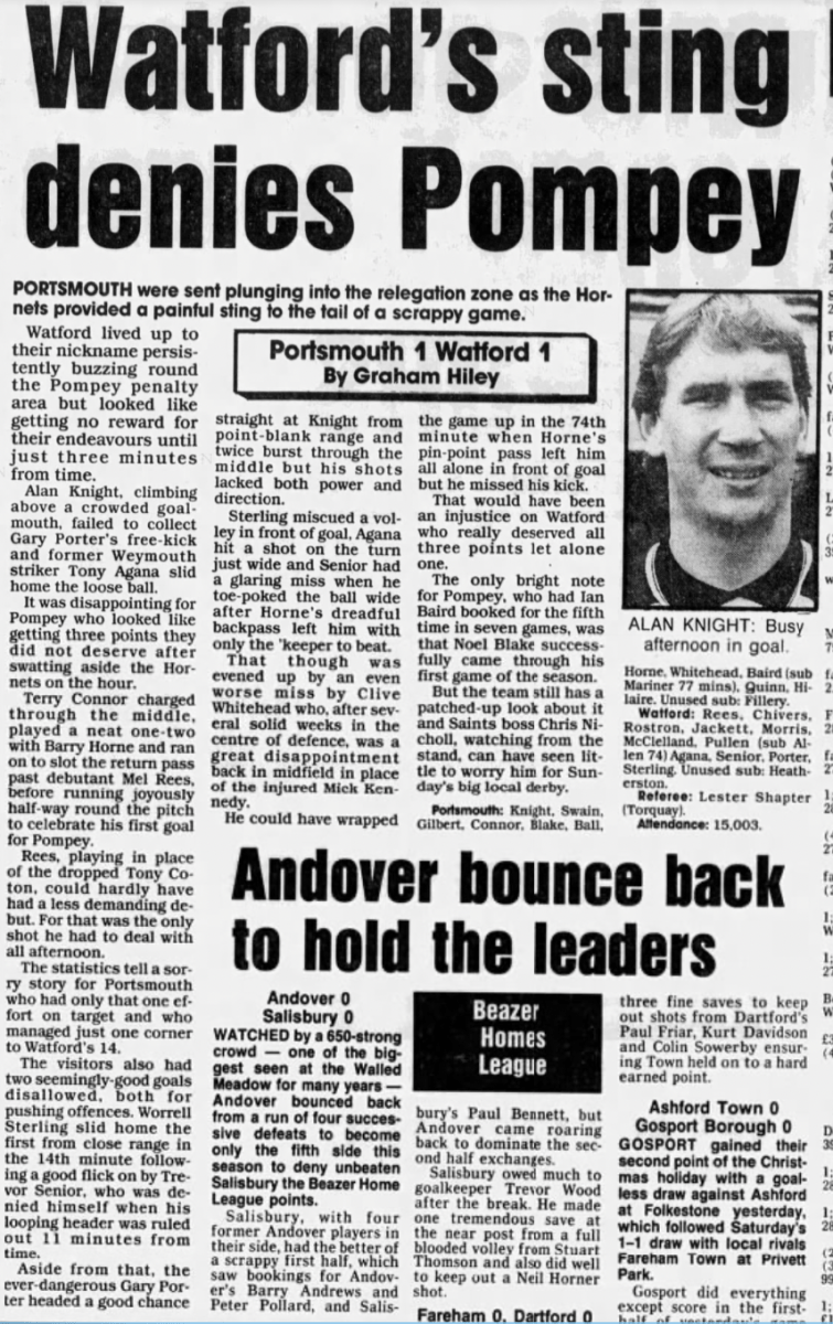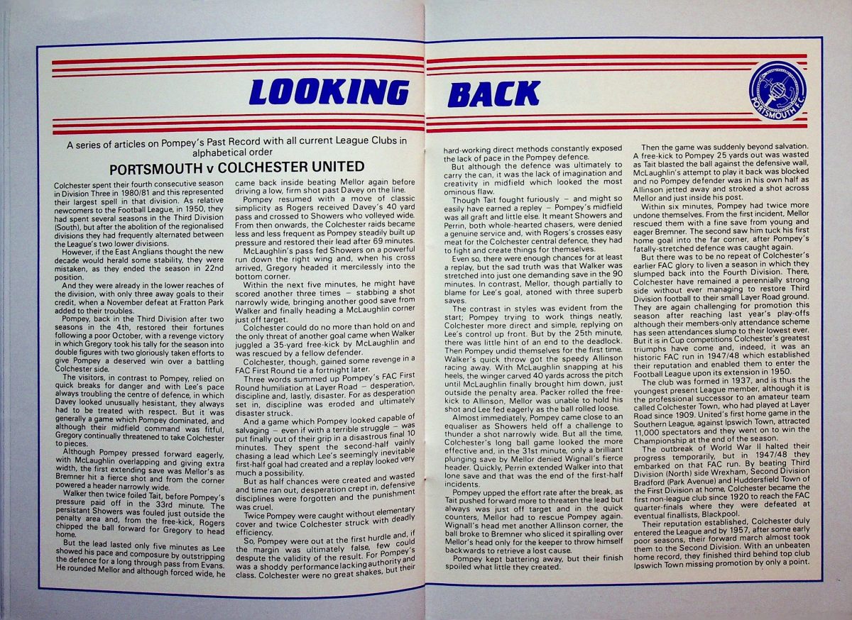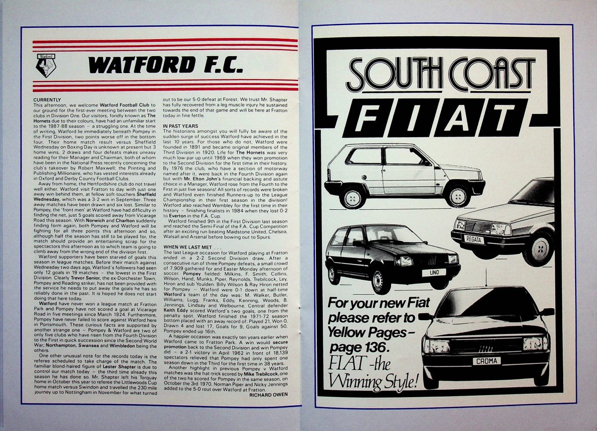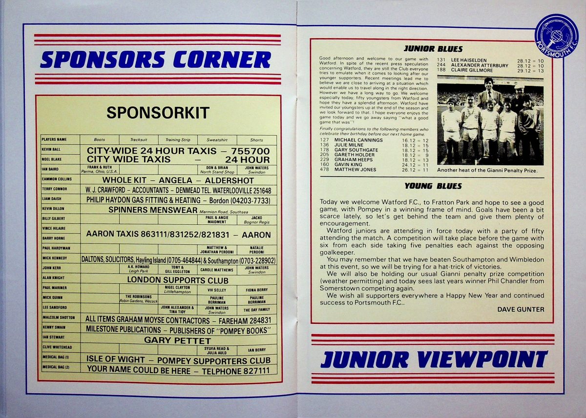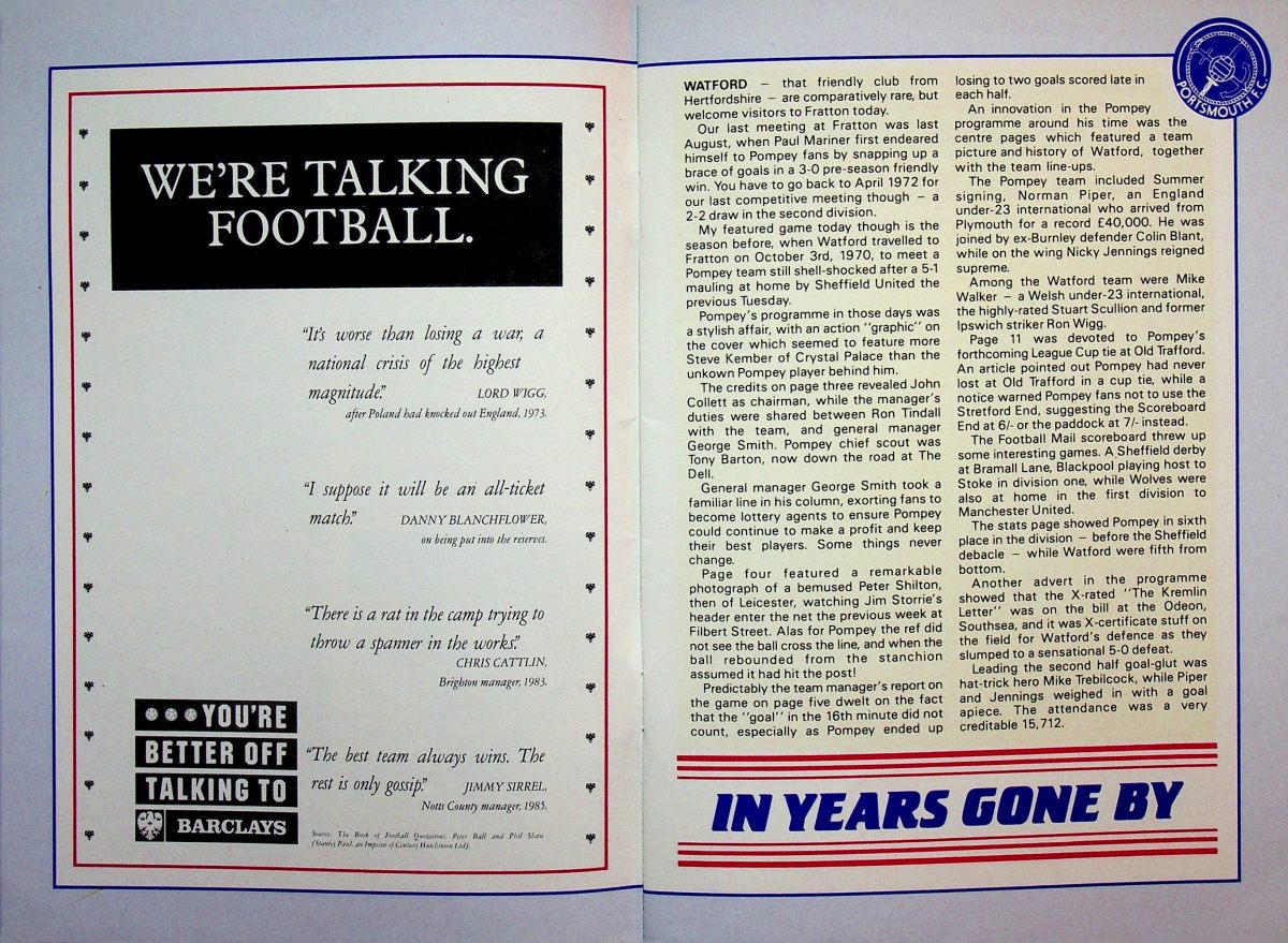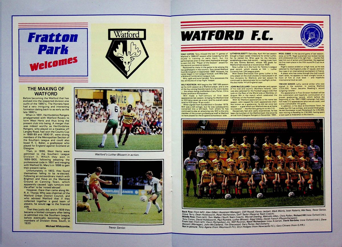 The tournament was played over three nights but we were only involved in the first. We won our group drawing with Newcastle and beating Oxford before losing to Group B winners Manchester United on penalties. I’ve no idea why the programme front cover featured an Umbro Watford kit from the 1980’s but it’s a nice touch. However I don’t remember our socks having yellow diamonds so maybe it was a generic Umbro image.
