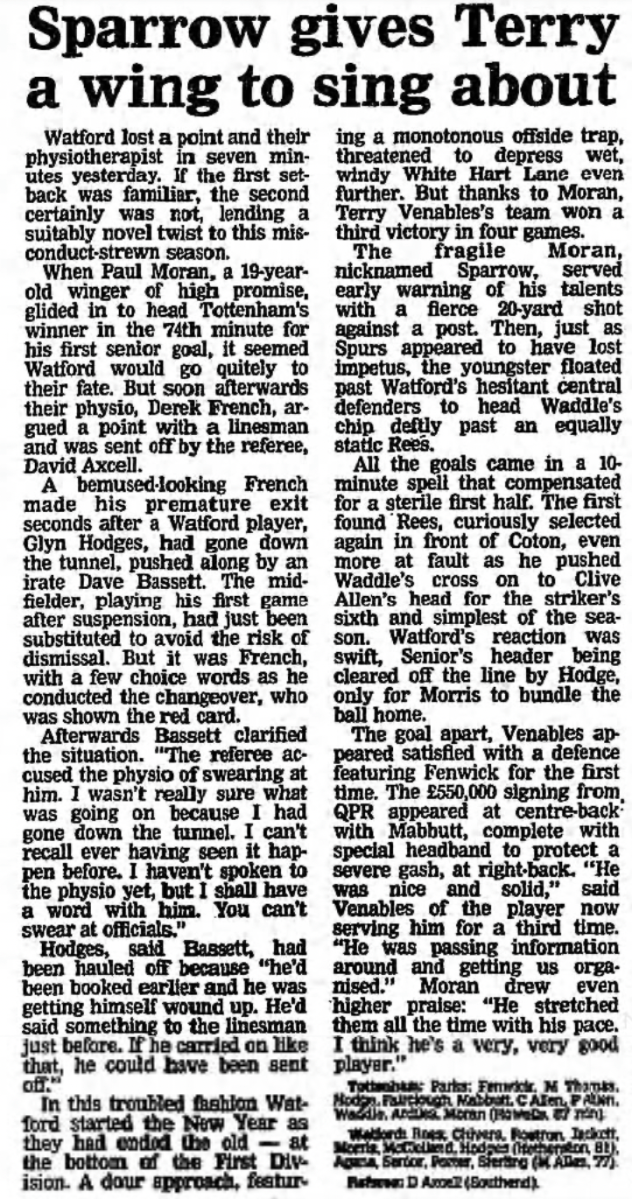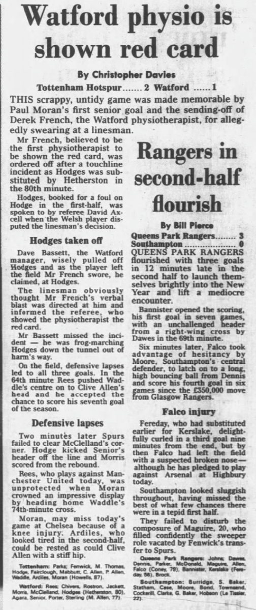 1st January 1988- Division One, Tottenham Hotspur 2 Watford 1 Watford physio Derek French was sent off for alledgedly swearing at a linesman. https://watford.fcdb.info/index.php?page=matches Guardian, 2 Jan 1988 Daily Telegraph, 2 January 1988 Share this: Share on X (Opens in new window) X Share on Facebook (Opens in new window) Facebook