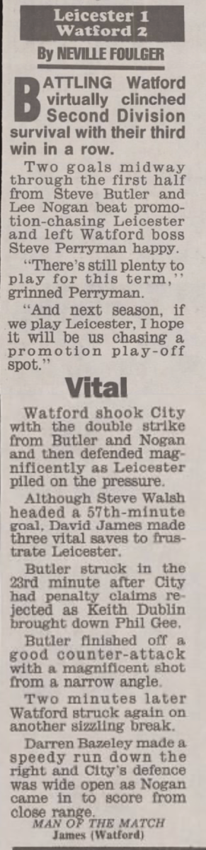 21st March 1992- Division Two, Leicester City 1 Watford 2 https://watford.fcdb.info/index.php?page=matches Sunday Mirror, 22 Mar 1992 Sunday People, 22 Mar 1992 Share this: Share on X (Opens in new window) X Share on Facebook (Opens in new window) Facebook