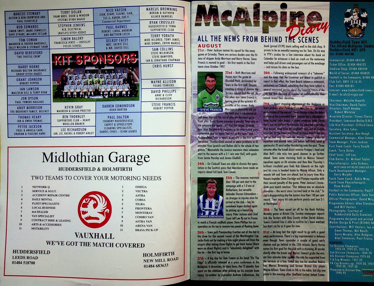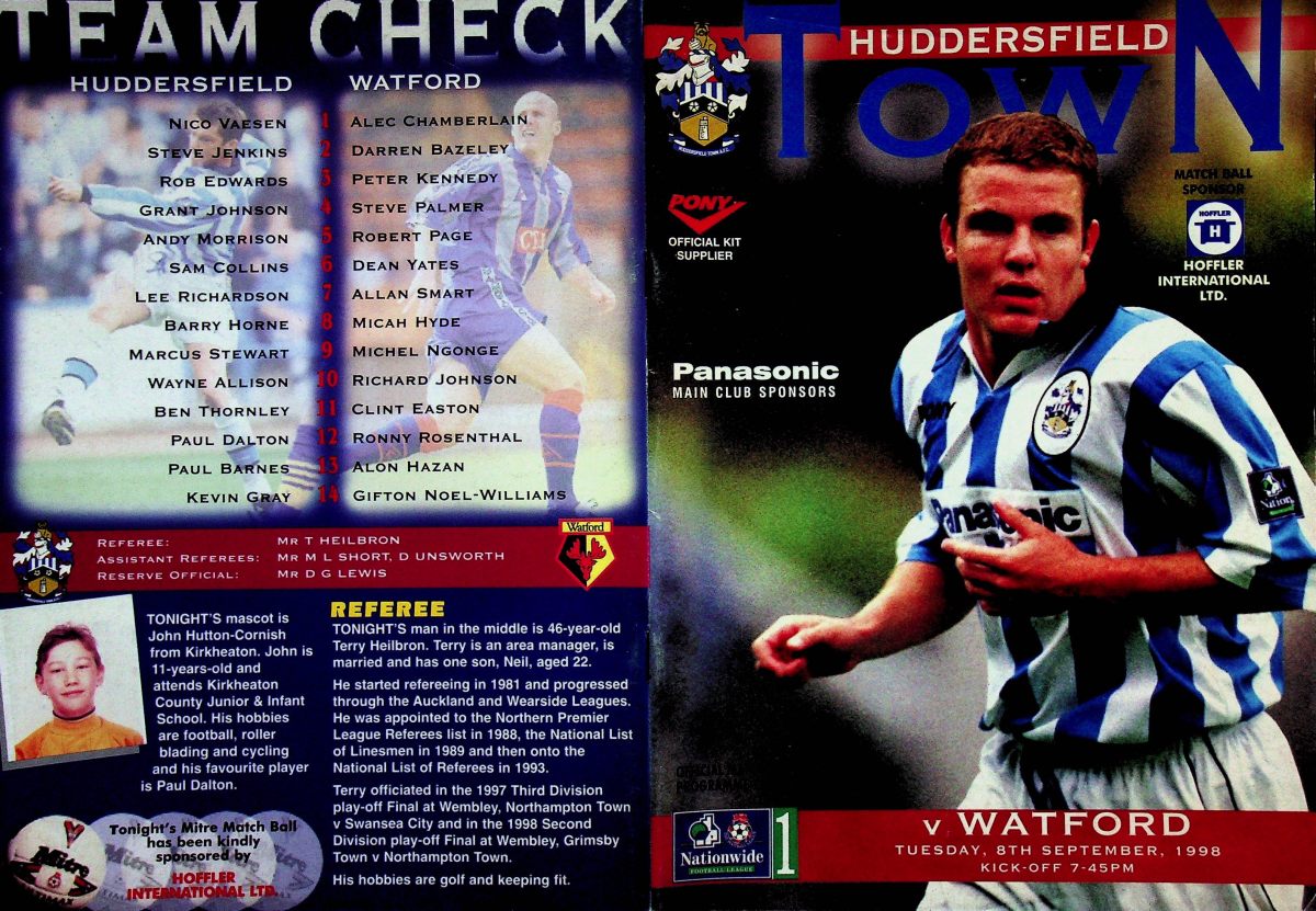 8th September 1998- New Division One, Huddersfield Town 2 Watford 0 Programme images courtesy of Matt Hall https://watford.fcdb.info/index.php?page=matches BSAD: The teams came out on to the pitch to a deafening rendition of the theme tune from “The Omen” (I kid you not) which quite successfully drowned out any crowd noise there might have been. We started with what appeared to be a fairly balanced though defensive line-up, with Gibbs, Kennedy, Palmer, Millen, and Yates in defence, Smart, Micah, and Johnno in midfield, and Ngonge and Smart leading the forward line. Huddersfield Daily Examiner, 8 Sep 1998 Daily Mirror, 9 Sep 1998 Share this: Share on X (Opens in new window) X Share on Facebook (Opens in new window) Facebook