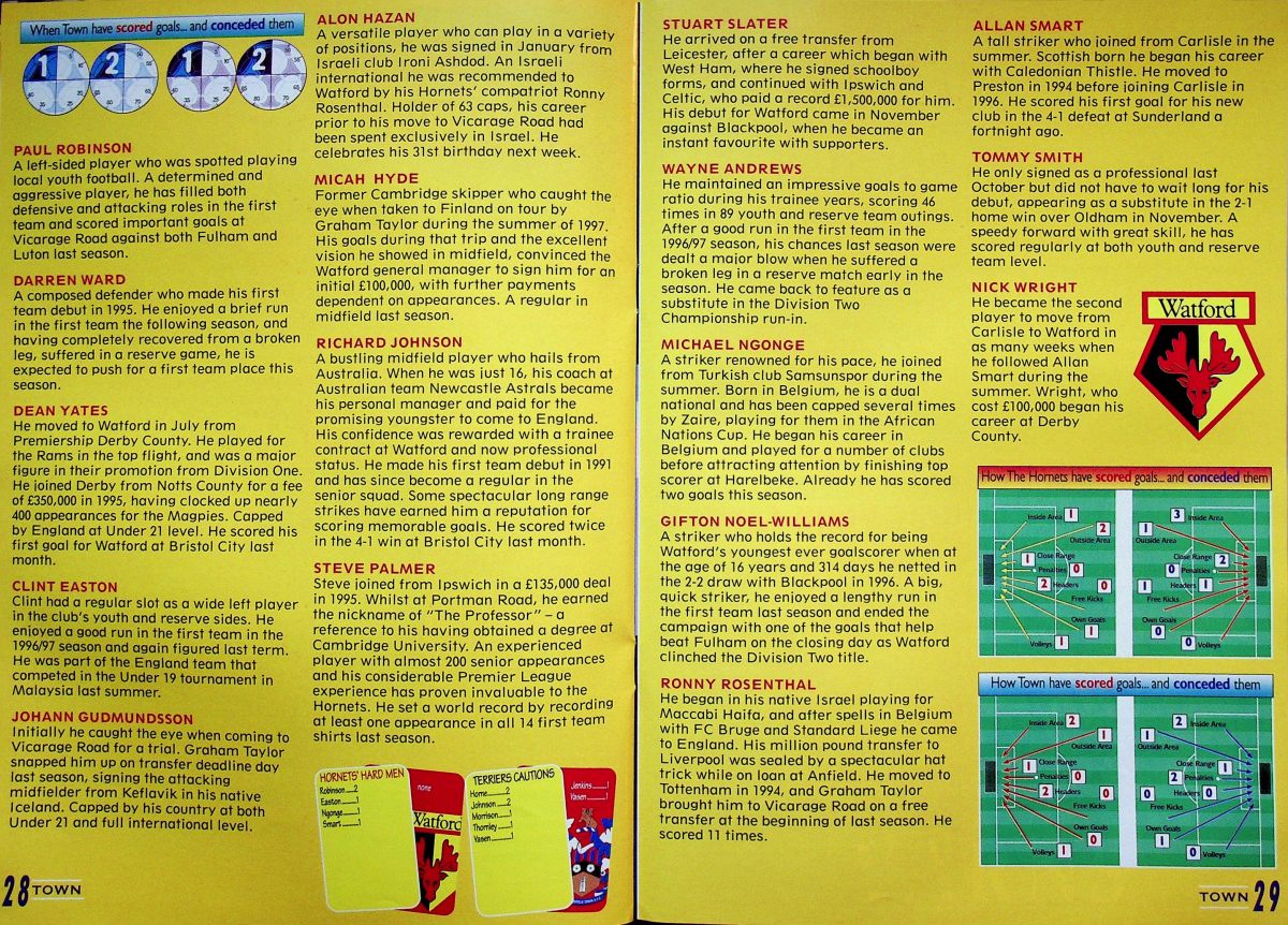 19th September 1998- New Division One, Swindon Town 1 Watford 4 Leave a Reply Wins like Saturday’s should be enjoyed for what they are, not what they might lead to. That the three points takes us up to fifth place really doesn’t matter to me; that they were gained by having so much hilarious, brilliant fun means everything. This was an absolute blast. Swindon Town Fan Site http://watford.fcdb.info?id=4317 https://www.soccerbase.com/matches/results.sd?date=1998-09-19 https://www.11v11.com/league-tables/league-division-1/19-september-1998/ The programme confusingly printed pictures of the win over Swindon along with Trefor Jones’ comments about our QPR victory on the same page29th September 1998- New Division One, Watford 1 Sheffield United 1 Share this: Share on X (Opens in new window) X Share on Facebook (Opens in new window) Facebook