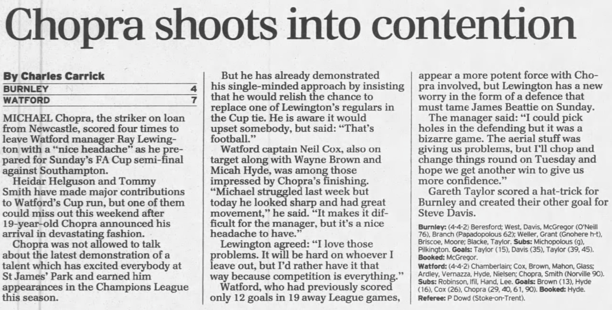 5th April 2003- New Division One, Burnley 4 Watford 7 Leave a Reply http://watford.fcdb.info?id=4550 Michael Chopra, on loan at Watford from Newcastle, scored four goals as the Hornets and Burnley contested an goal-packed fixture at Turf Moor. Watford will approach Sunday’s FA Cup semi-final against Southampton with greater confidence now that they appear to have solved their scoring problem. Burnley Express Report:Â BEMUSED Burnley fans didnt know whether to laugh or cry after this latest debacle. Daily Telegraph, 7 Apr 2003 BSAD report:To put this game into the perspective, it demands a flick through Trefor Jones, and to an era that I would be amazed if anyone in the away end on Saturday remembered. In 1937, Watford were managed by Neil McBain. We finished fourth in the old Division Three (South), and on April 10th that year, the players completed a league double over Torquay by winning 7-4 at Plainmoor. Only 2,277 watched the game, and one would hazard a guess that of those, only a handful would have been Watford fans. Another BSAD report:Living in the north east, when the Golden Boys come to town it is an occasion not to be missed, so when the Academy Under 17 side was drawn away to Newcastle United last Saturday, my son Josh and I felt we had to be there instead of…you’ve guessed it…traipsing down to Burnley. Taken from https://www.watfordfc.com/teams/first-team/home-away-burnley Taken from programme on 20th August 2005- Championship, Watford 3 Burnley 1 21st April 2003- Championship, Watford 2 Derby County 0 Share this: Click to share on X (Opens in new window) X Click to share on Facebook (Opens in new window) Facebook