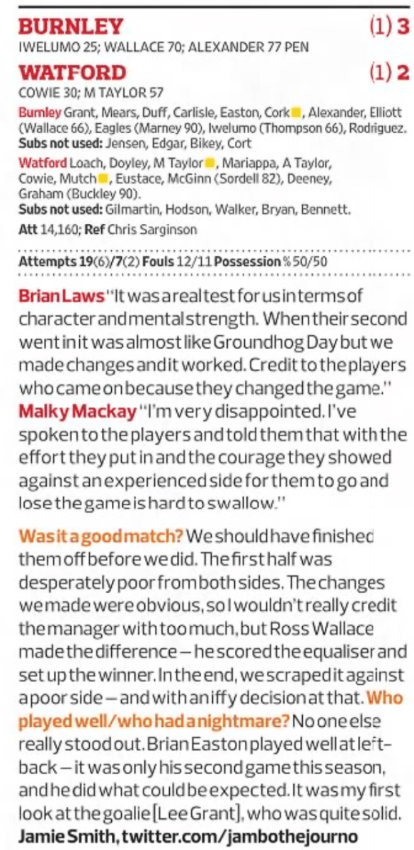 13th November 2010- Championship, Burnley 3 Watford 2 https://watford.fcdb.info/index.php?page=matches Observer, 14 Nov 2010 BBC: The home side struck first when Chris Iwelumo headed in from 12 yards. But Watford levelled when Dan Cowie hit a left-footed effort into the bottom corner and Martin Taylor headed them in front from Jordon Mutch’s cross. However, substitute Ross Wallace fired in from six yards and after Taylor fouled Jay Rodriguez, Graham Alexander fired the penalty into the top corner. Share this: Share on X (Opens in new window) X Share on Facebook (Opens in new window) Facebook