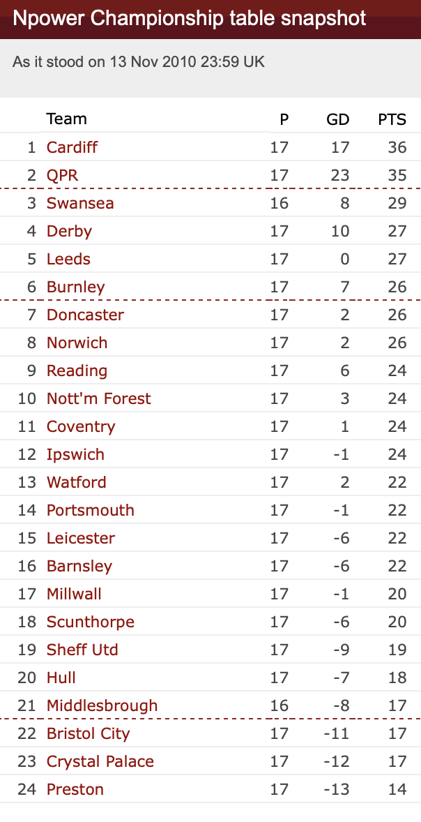 20th November 2010- Championship, Watford 1 Reading 1 Leave a Reply There was much about Watford’s performance that was concerning but nothing terribly surprising, and nothing for which a clear solution presents itself. We knew that we were going into the season with a young side that was going to be dependent on senior players; we’ve already seen, in Cowie’s absence, the impact that removing one of those cogs can have on the whole shape of the side. More of the same today; Jordon Mutch and Stephen McGinn both had reasonable games in the middle of the park but the whole side missed the steadying influence, the aggression, the option, the foot-on-the-ball of John Eustace in the centre. Ross Jenkins might have reminded us of what he best offers, an option not really suited to pairing with the skipper for whom he’d have been the most obvious replacement but for his ankle injury. http://watford.fcdb.info?s=39599&id=4936 https://www.soccerbase.com/matches/results.sd?date=2010-11-20 https://www.11v11.com/league-tables/league-championship/20-november-2010/ Share this: Share on X (Opens in new window) X Share on Facebook (Opens in new window) Facebook