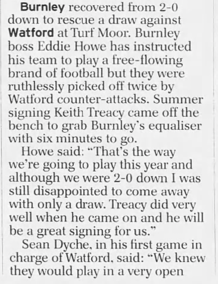 6th August 2011-Championship, Burnley 2 Watford 2 Leave a Reply http://watford.fcdb.info?id=4967 Taken from 13 Aug 2011 Watford v Derby County programme Substitute Keith Treacy marked his Burnley debut by scoring a late equaliser to deny Sean Dyche a dream start to his Watford reign. Rookie boss Dyche, 40, saw his side race into a 2-0 lead through Craig Forsyth and Mark Yeates. Yet the Clarets roused themselves in the final 13 minutes as Charlie Austin pulled a goal back before fellow substitute Treacy – a summer signing from Preston – headed an 84th-minute equaliser. report Report:Iwelumo, Dickinson, Forsyth all extra targets at set pieces. So it was that Martin Taylor was unmarked beyond the far post… let’s just say that again, Martin Taylor. Unmarked. Honestly…. Sunday Telegraph, 7 Aug 2011 https://www.soccerbase.com/matches/results.sd?date=2011-08-06 https://www.11v11.com/league-tables/league-championship/06-august-2011/ Share this: Share on X (Opens in new window) X Share on Facebook (Opens in new window) Facebook