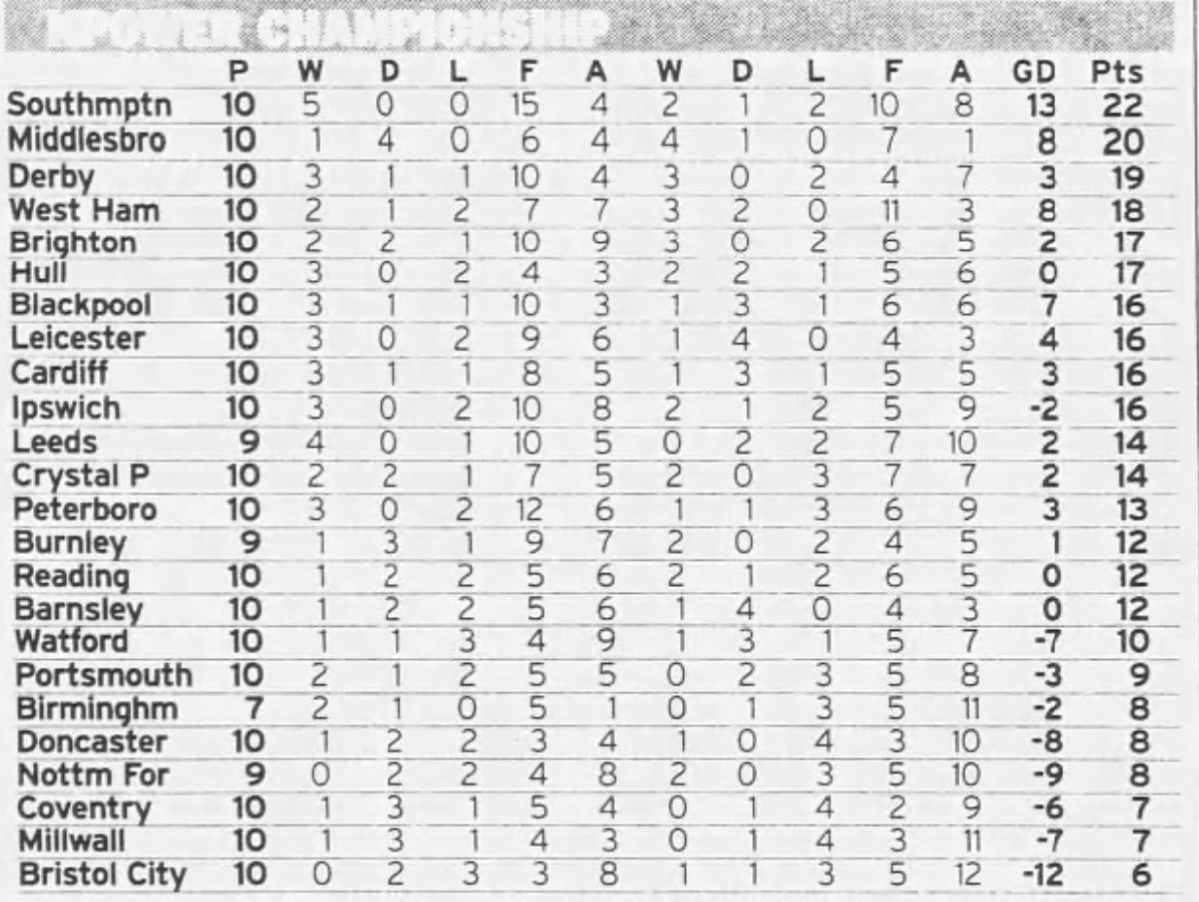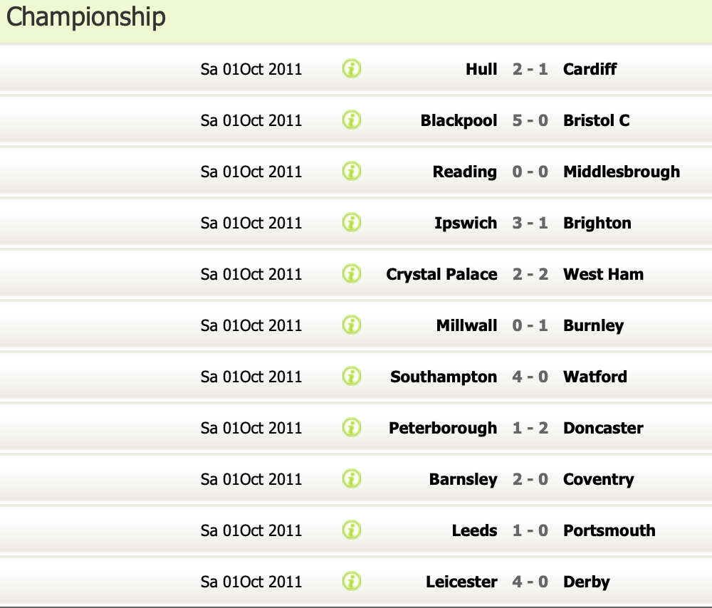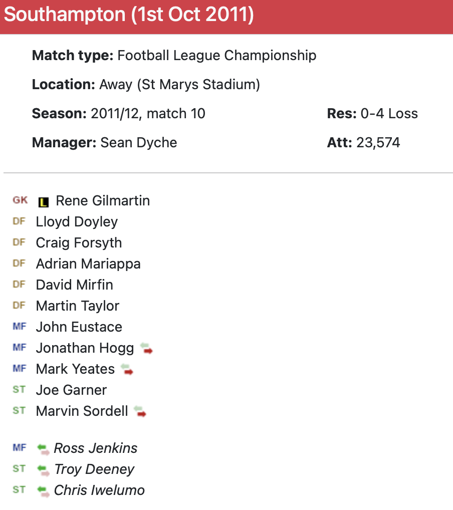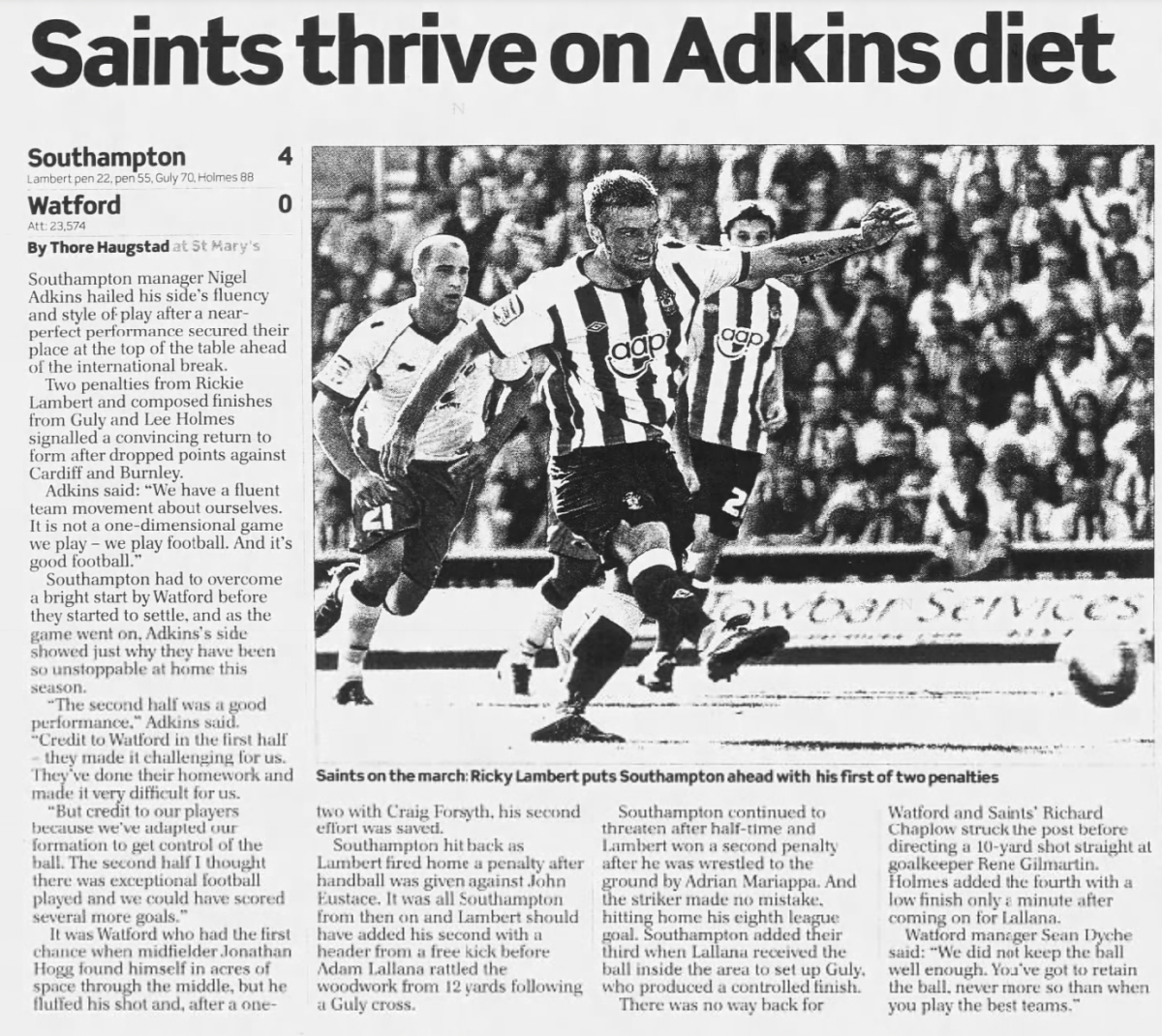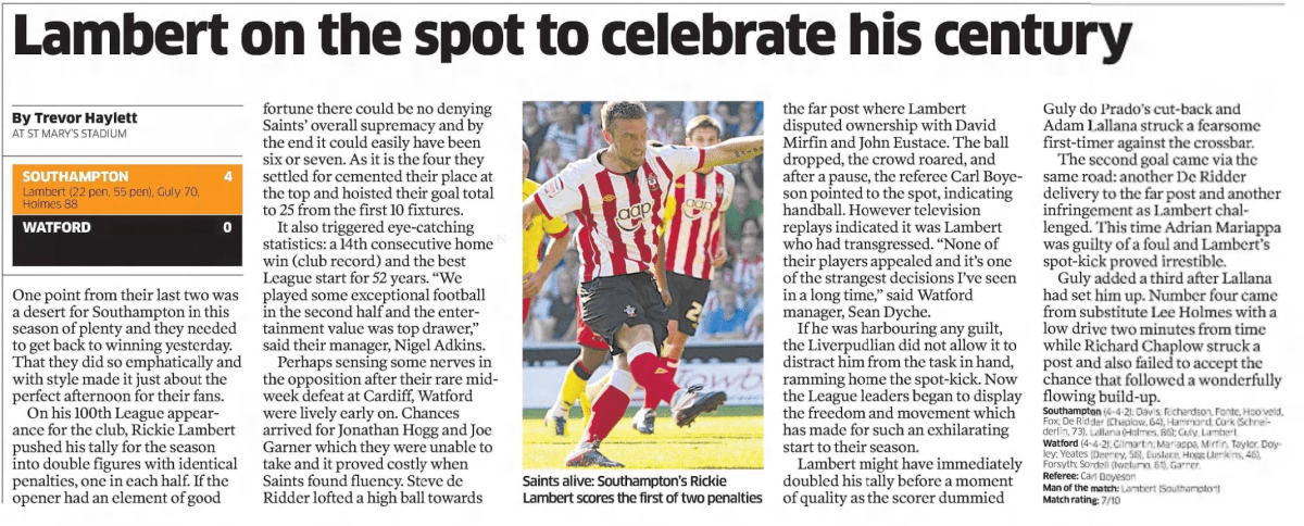 1st October 2011- Championship, Southampton 4 Watford 0 https://watford.fcdb.info/index.php?page=matches Sunday Telegraph, 2 Oct 2011 Independent, 2 Oct 2011 https://www.soccerbase.com/matches/results.sd?date=2011-10-01 Independent Share this: Click to share on X (Opens in new window) X Click to share on Facebook (Opens in new window) Facebook
