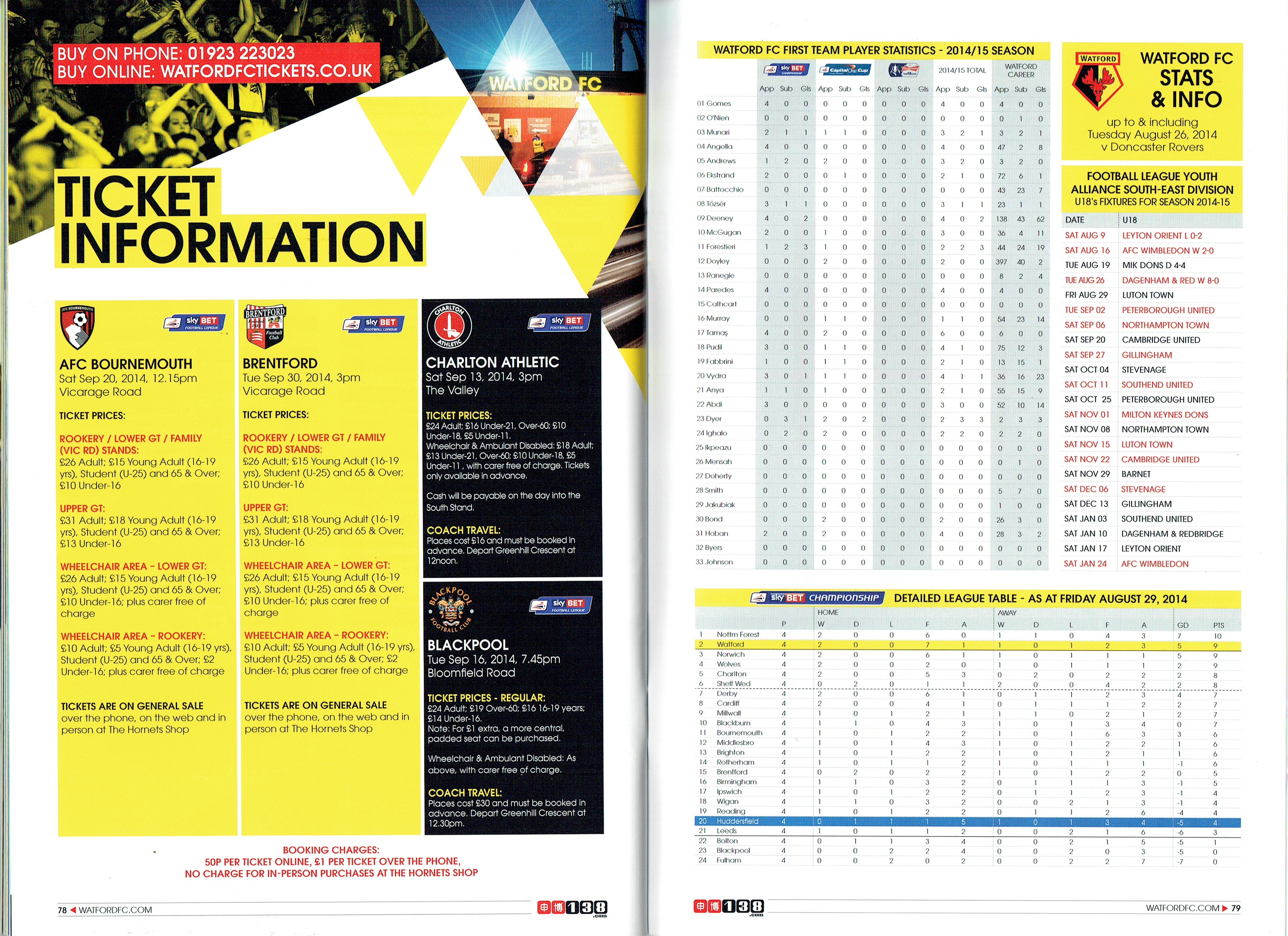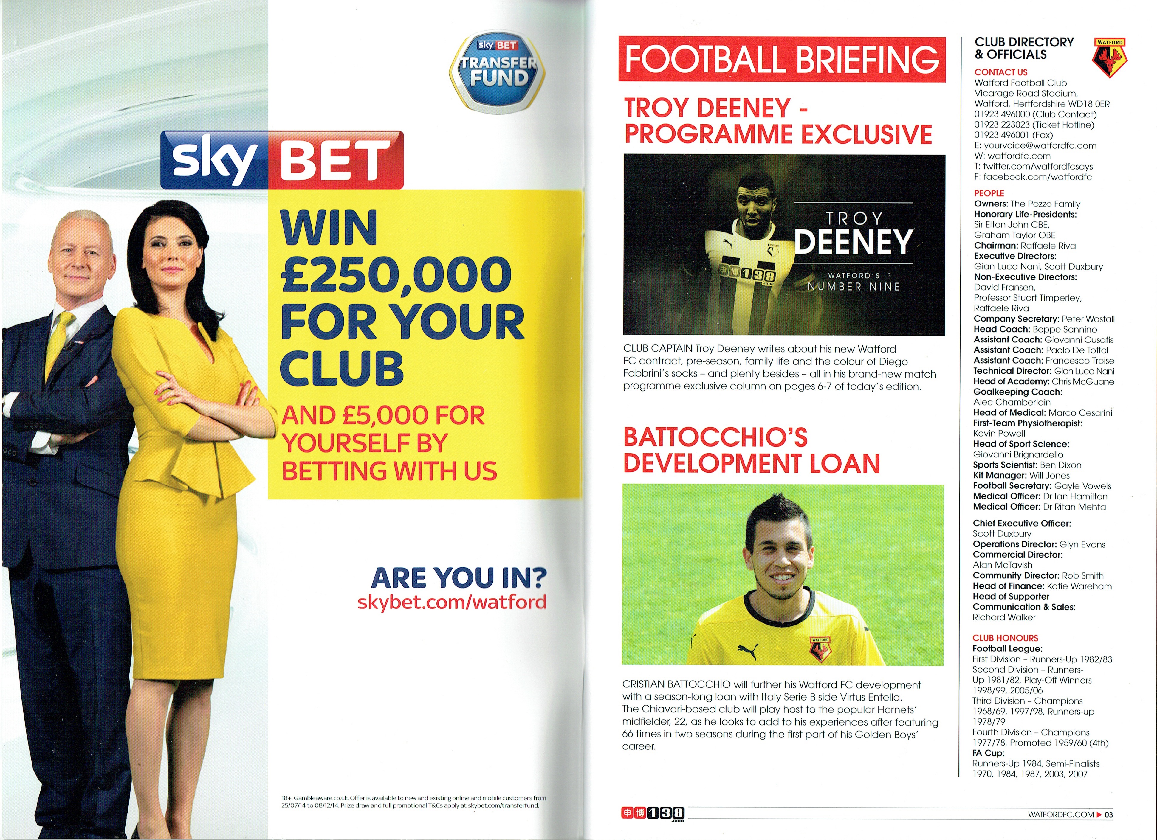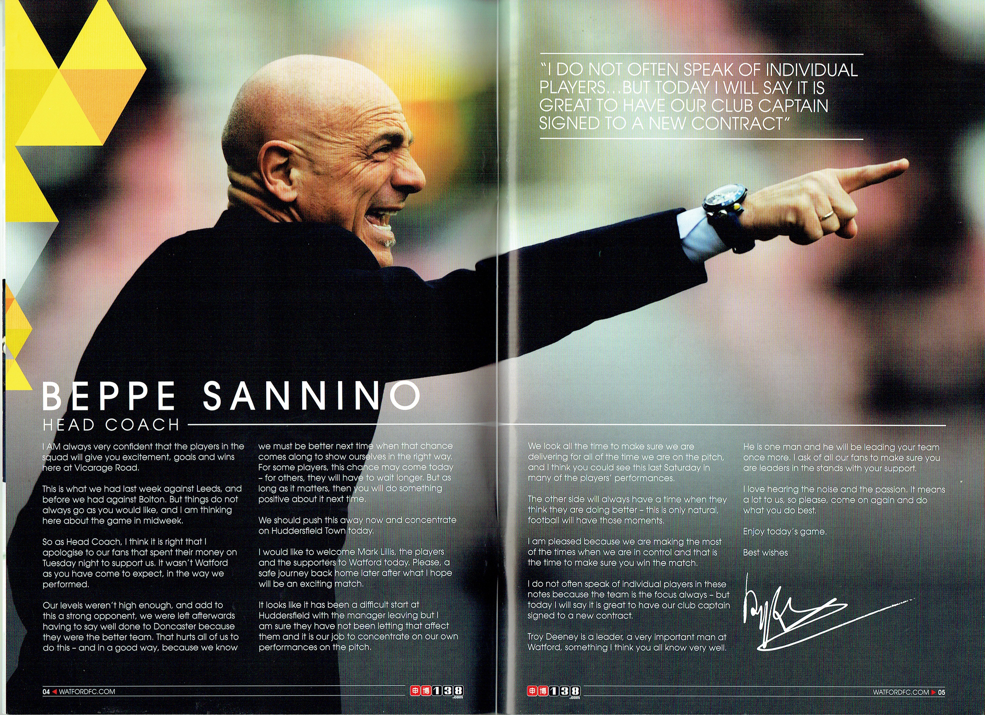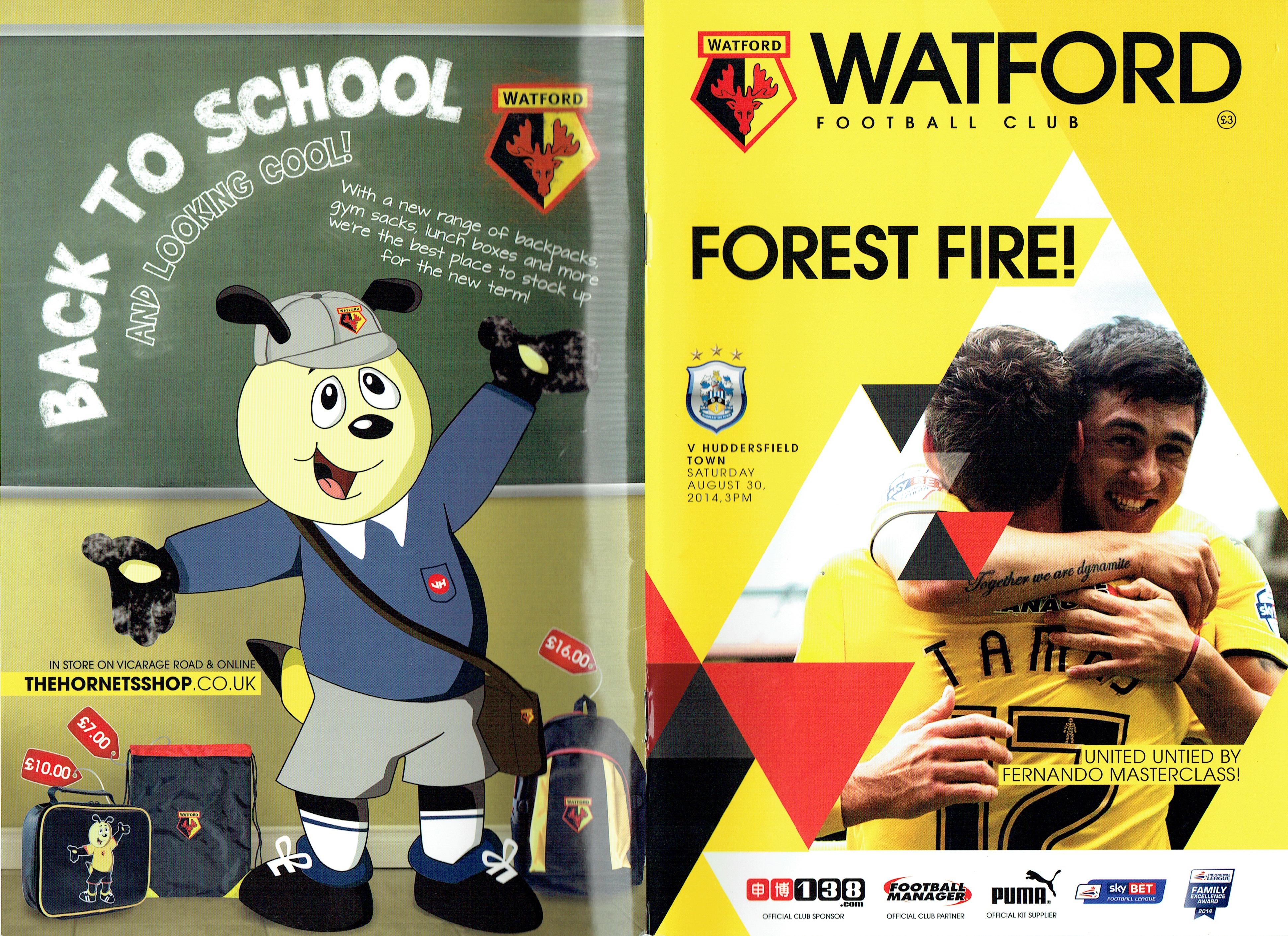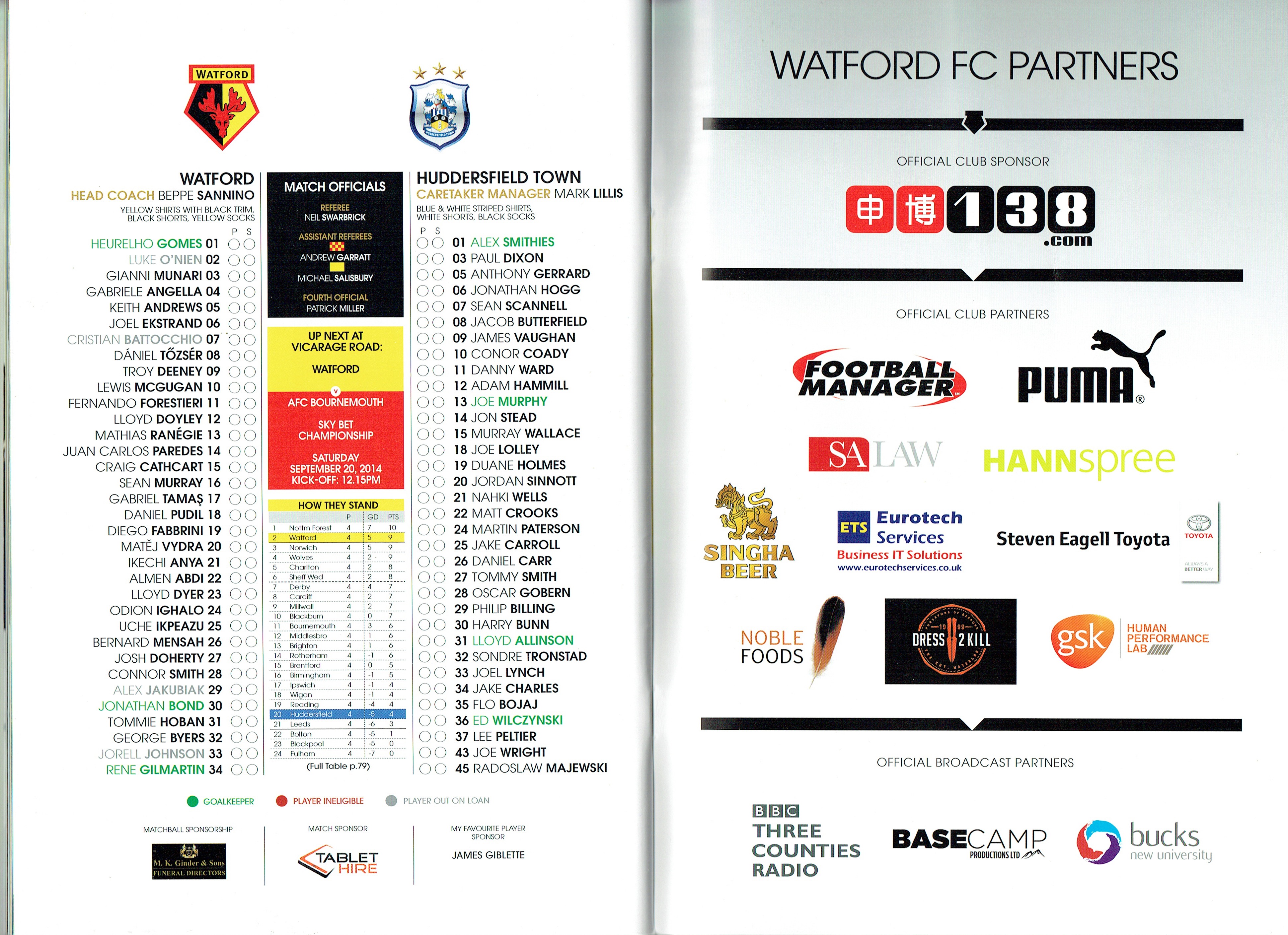 30th August 2014- Championship, Watford 4 Huddersfield Town 2 Leave a Reply Beppe Sannino’s final programme notes. http://watford.fcdb.info?id=5126 Championship side Watford scored twice after being reduced to 10 men to secure a 4-2 win against Huddersfield. Keith Andrews headed in a corner after Gabriel Tamas’s 65th minute sending off and Almen Abdi curled in a late right-footed strike to secure the points. Watford-4-2-Huddersfield-Town-BBC-SportDownload There had been questions before the game, more were raised during the ninety-plus minutes and we’ll get to those, I suppose. But for the moment revel again in that fabulous final half hour or so, which in the manner of a cup-tie blew away all concerns, quibbles, tactics, formations. Primal, ferocious and utterly captivating entertainment. Who could fail to be carried away by it? While I’ve been writing this report, the news of Beppe Sannino’s departure has broken. In my few encounters with Beppe, I found him a very engaging man, but I hadn’t always been a fan of the way his teams played. There were a lot of dreadful performances last season and the last encounter with Huddersfield was certainly one in which you felt that the players had no respect for the manager. That was also my impression at the end of season dinner. When Beppe took the stage to make his speech, there was little warmth or respect emanating from the tables of players who were just next to us. I was amazed that he was still in charge at the start of the season. The fact that he has now left suggests that the Pozzos have found his replacement. Someone described the contrast of the Zola and Sannino reigns as being from a holiday camp to a boot camp. I hope that the new manager is somewhere in the middle. We have a huge amount of talent in this team, with some organization and discipline we could be unbeatable. Share this: Share on X (Opens in new window) X Share on Facebook (Opens in new window) Facebook