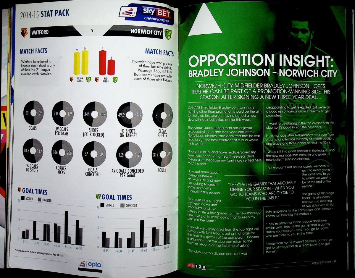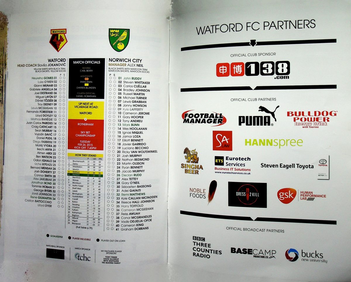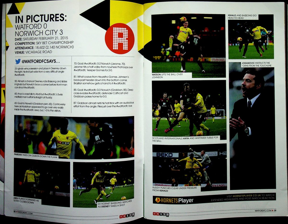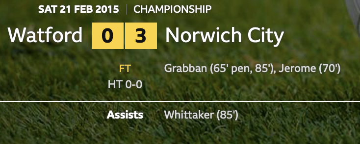 21st February 2015- Championship, Watford 0 Norwich City 3 BBC: Norwich City scored three goals in the final 25 minutes to beat play-off rivals Watford and move to within four points of the top two. BHappy: Much has been made of the limited number of chances that we made throughout, but our defence had looked solid and Norwich’s compact shape cost them in terms of the number of bodies they were able to commit forward. Frankly, if anyone was going to score it was us but you would have been reckless to put money on that for all of our attacking riches.  So…  the award of the penalty was both unexpected on any number of levels and absolutely fundamental to the outcome; like ourselves City had barely had any controlled possession in the final third but Hoolahan put his head down and ran, and then fell over.  The referee gave the penalty, Gomes went the right way and got down well but the kick was right in the corner.  It hadn’t looked like a penalty, and the Hornets’ frustration with an official whose control on the game had been fingertip since the first whistle nearly boiled over.  We’d nullified City’s threat, there seemed no prospect of them scoring and the decision to award the penalty changed the game; newly invigorated, the visitors had no cause to deviate from the sit-deep-and-break approach that so many have tried before, if rarely as effectively. Fran’s Watford Blog: There were no boos at the final whistle, mainly because those who indulge in such behaviour had set off for home some time beforehand. After some terrific performances in the last few weeks, it is difficult to be critical. The penalty that shouldn’t have been was definitely a turning point, but it was disappointing that we capitulated rather than fighting back as we did at Bolton and Brentford. Norwich came to disrupt our play and we allowed them to do so a little too easily. The scoreline flattered the visitors, but we barely had a shot on goal so didn’t deserve anything from the game. Thankfully, we have another home match on Tuesday in which to get this out of our system. https://www.bbc.co.uk/sport/football/31466186 Share this: Share on X (Opens in new window) X Share on Facebook (Opens in new window) Facebook