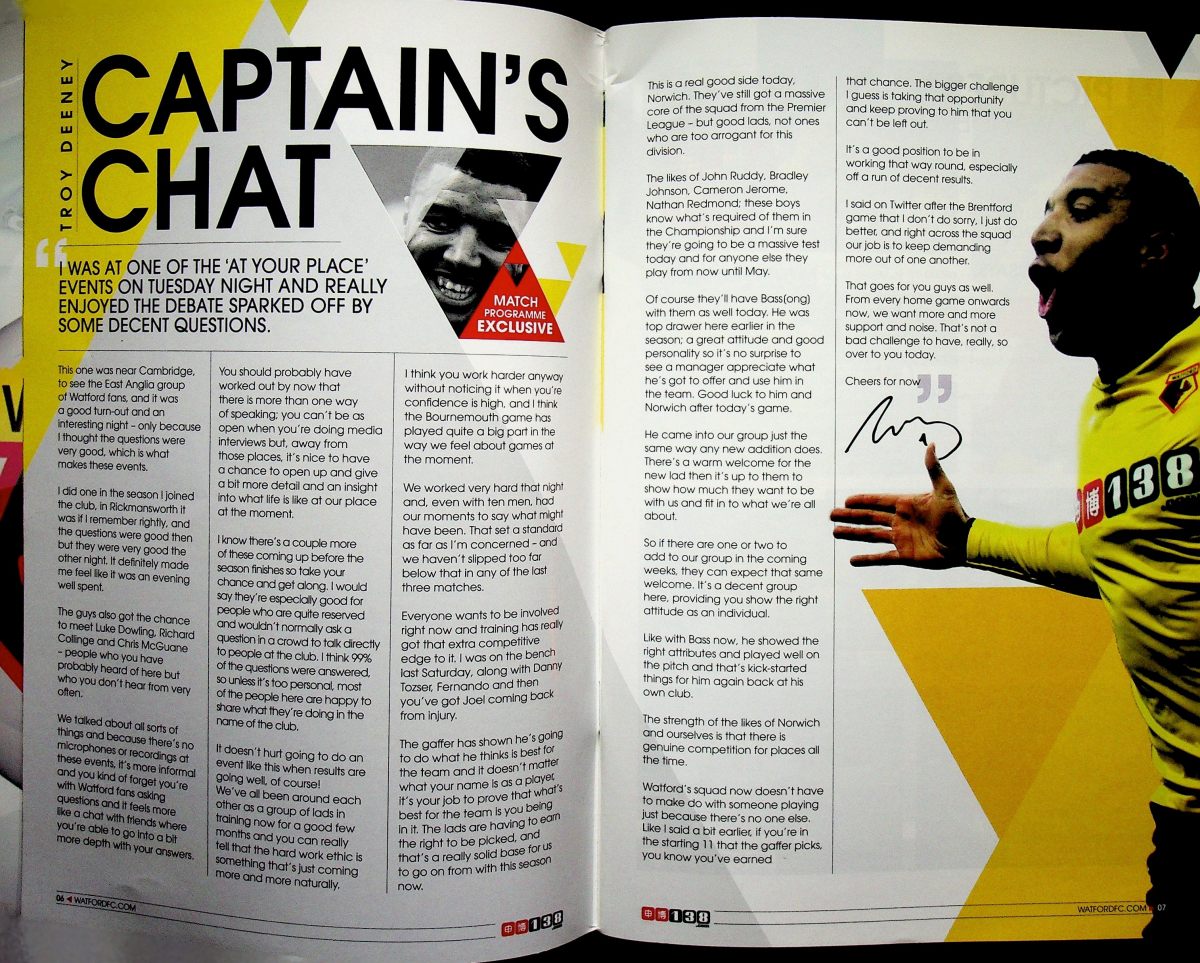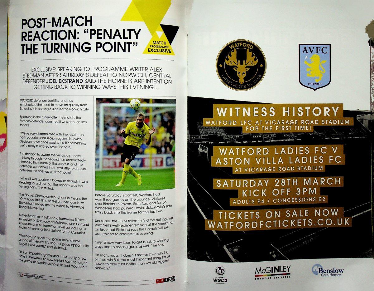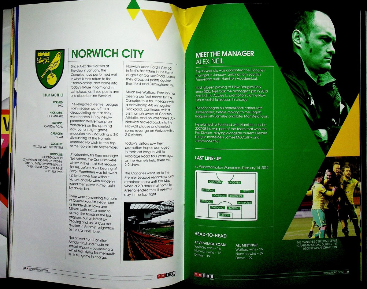 21st February 2015- Championship, Watford 0 Norwich City 3 BBC: Norwich City scored three goals in the final 25 minutes to beat play-off rivals Watford and move to within four points of the top two. BHappy: Much has been made of the limited number of chances that we made throughout, but our defence had looked solid and Norwich’s compact shape cost them in terms of the number of bodies they were able to commit forward. Frankly, if anyone was going to score it was us but you would have been reckless to put money on that for all of our attacking riches.  So…  the award of the penalty was both unexpected on any number of levels and absolutely fundamental to the outcome; like ourselves City had barely had any controlled possession in the final third but Hoolahan put his head down and ran, and then fell over.  The referee gave the penalty, Gomes went the right way and got down well but the kick was right in the corner.  It hadn’t looked like a penalty, and the Hornets’ frustration with an official whose control on the game had been fingertip since the first whistle nearly boiled over.  We’d nullified City’s threat, there seemed no prospect of them scoring and the decision to award the penalty changed the game; newly invigorated, the visitors had no cause to deviate from the sit-deep-and-break approach that so many have tried before, if rarely as effectively. Fran’s Watford Blog: There were no boos at the final whistle, mainly because those who indulge in such behaviour had set off for home some time beforehand. After some terrific performances in the last few weeks, it is difficult to be critical. The penalty that shouldn’t have been was definitely a turning point, but it was disappointing that we capitulated rather than fighting back as we did at Bolton and Brentford. Norwich came to disrupt our play and we allowed them to do so a little too easily. The scoreline flattered the visitors, but we barely had a shot on goal so didn’t deserve anything from the game. Thankfully, we have another home match on Tuesday in which to get this out of our system. https://www.bbc.co.uk/sport/football/31466186 Share this: Share on X (Opens in new window) X Share on Facebook (Opens in new window) Facebook