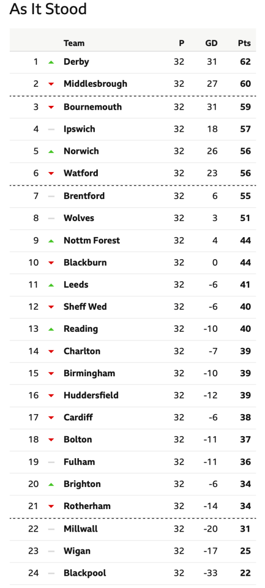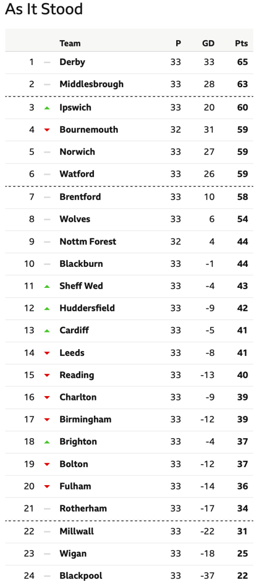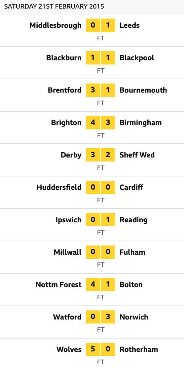 14th February 2015- Championship, Bolton Wanderers 3 Watford 4 Leave a Reply 1-0 2-2 3-2 4-3 http://watford.fcdb.info/index.php?page=matches A late winner from substitute Troy Deeney gave Watford all three points from a seven-goal thriller at Bolton. Deeney, a 57th-minute substitute for Gabriele Angella, beat Andy Lonergan with a low shot from 16 yards to give his side victory in a breathtaking festival of attacking football. When the final whistle went, a couple of the Watford players dropped to the ground as did a number of the Bolton players. They all looked dead on their feet and certainly those of us in the stands were completely drained. What a terrific game of football. There were ecstatic grins in the away end and hugs between friends and, most likely, complete strangers. The players came over and were greeted as the heroes that they were. Ighalo, Layun, Forestieri and Deeney thanked us by nipping over the advertising hoardings to give their shirts to the crowd. https://www.soccerbase.com/matches/results.sd?date=2015-02-14 https://www.11v11.com/league-tables/league-championship/14-february-2015/ Share this: Share on X (Opens in new window) X Share on Facebook (Opens in new window) Facebook
