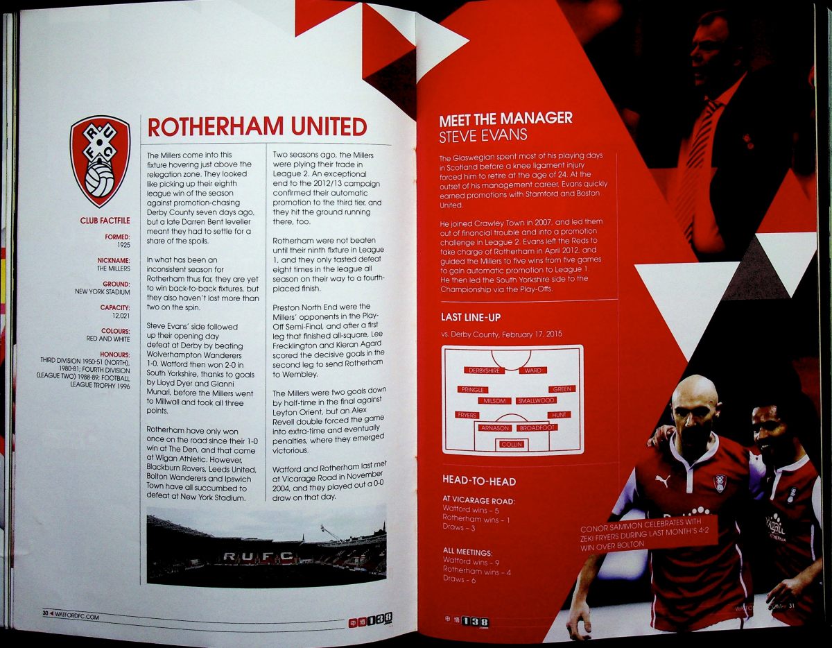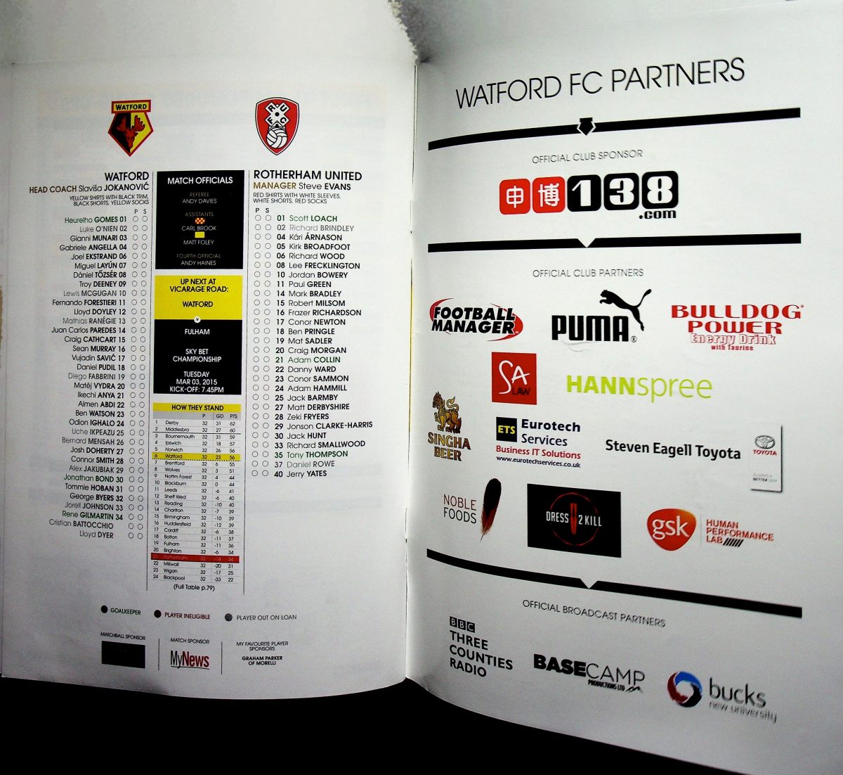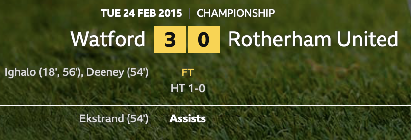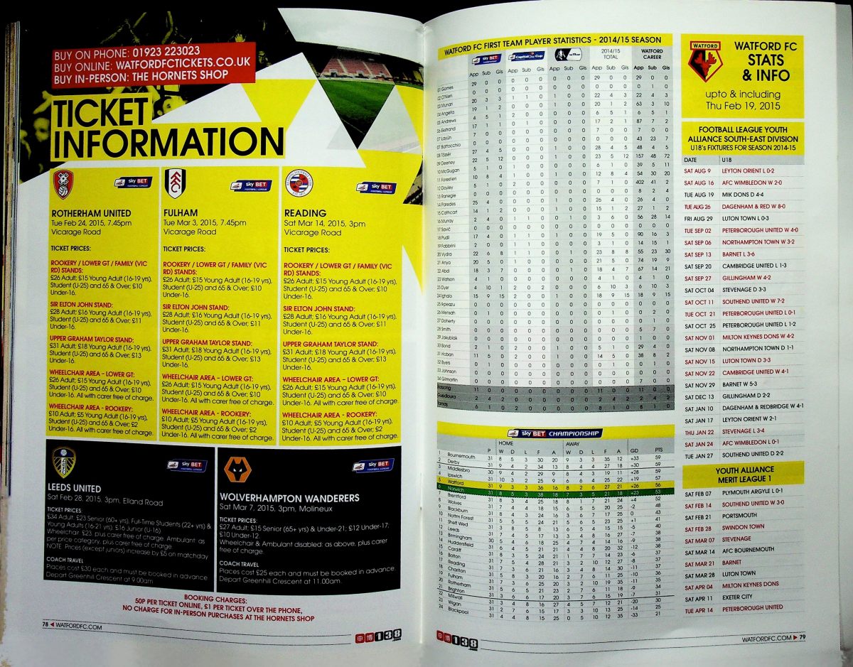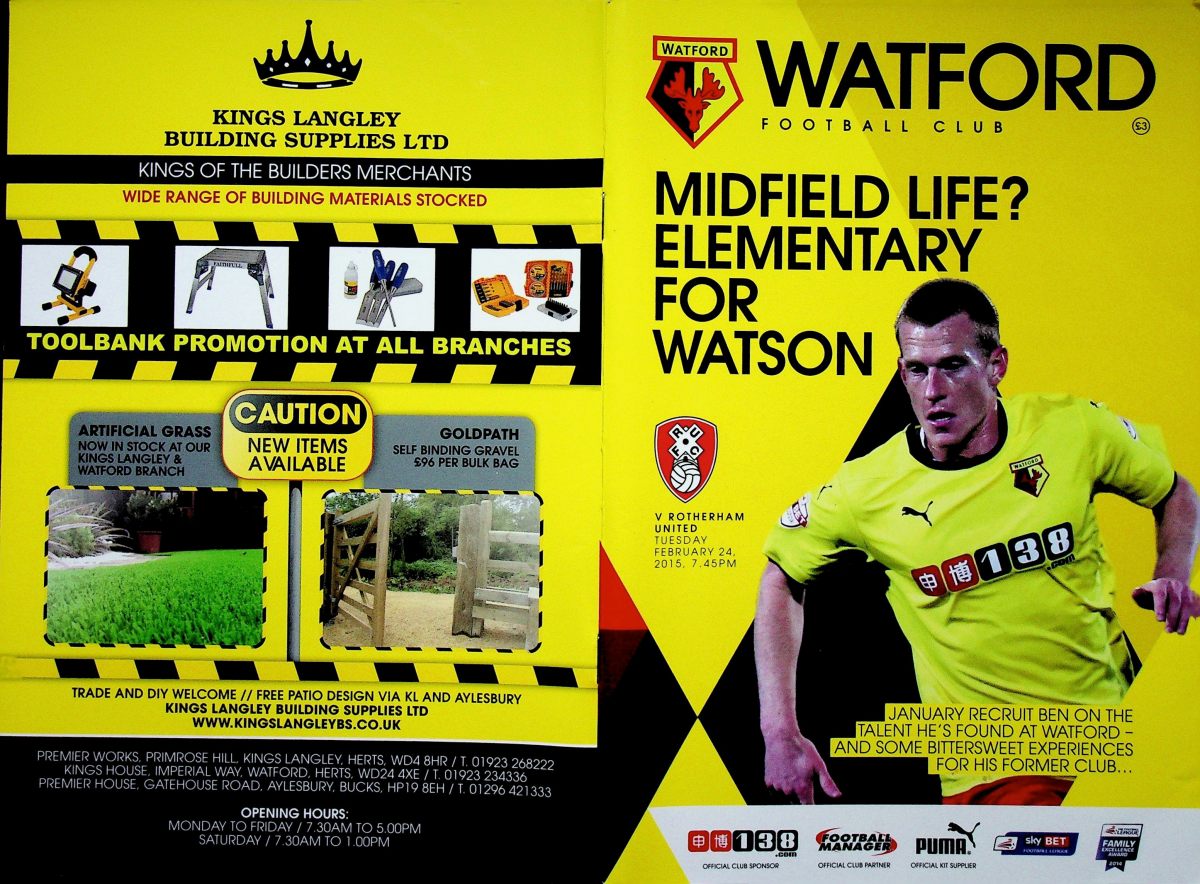 24th February 2015- Championship, Watford 3 Rotherham United 0 WFC.Net Goal Commentary: 1  2  3 BBC: Watford maintained their bid for automatic promotion as Odion Ighalo scored twice in a comprehensive win over struggling Rotherham. Sky: Odion Ighalo continued his superb run of scoring form with another two goals while strike partner Troy Deeney also netted as the Hornets remained six points behind leaders Derby. BHappy: So it was a curious game, except that curious makes it sound interesting and it really wasn’t that. It was curious in the sense that we’d done almost nothing to earn our half-time lead, basically just sitting in our own half and watching the enemy through binoculars until their sentry fell asleep. Aside from a Deeney snap-shot, our openings were entirely of Rotherham’s making, a defender falling over and a clearance rebounding back into the penalty area. We were set up to be a brick wall, albeit one which still managed to allow Arnason a completely free header from a corner for what should’ve been a prompt equaliser. That might’ve changed things. If you’re going to play a formation as miserable as this one, you’d really better not screw it up. As it was, the grumbling was mainly concentrated on the inability of either of our makeshift full-backs to take a proper throw-in. Fran’s Watford Blog: There was much complaining after the game because, convincing as the win had been, it was the dullest 3-0 imaginable. The way the team had been set up meant there was no width and little free-flowing football. Still a win is a win, the goal difference is improved and it is very tight at the top of the table. Sometimes dull is good. https://www.bbc.co.uk/sport/football/31498592 Share this: Share on X (Opens in new window) X Share on Facebook (Opens in new window) Facebook