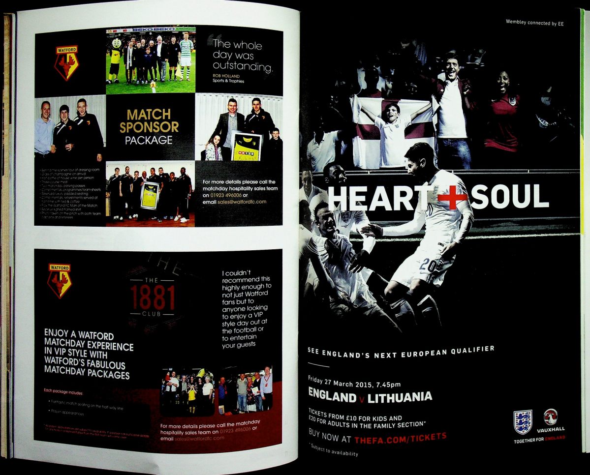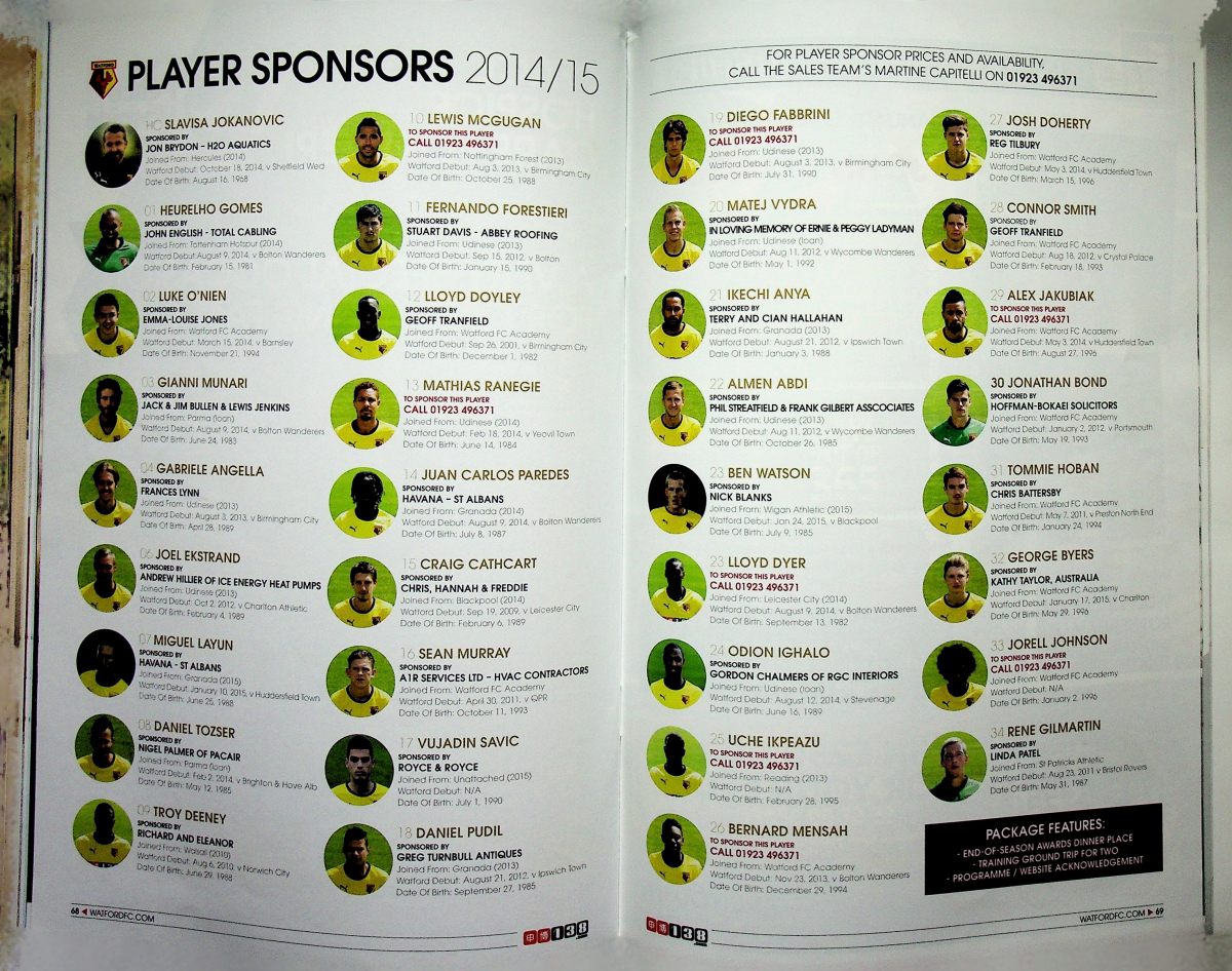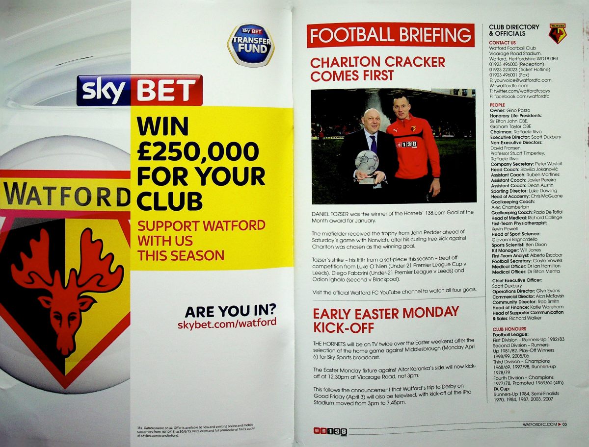24th February 2015- Championship, Watford 3 Rotherham United 0 WFC.Net Goal Commentary: 1  2  3 BBC: Watford maintained their bid for automatic promotion as Odion Ighalo scored twice in a comprehensive win over struggling Rotherham. Sky: Odion Ighalo continued his superb run of scoring form with another two goals while strike partner Troy Deeney also netted as the Hornets remained six points behind leaders Derby. BHappy: So it was a curious game, except that curious makes it sound interesting and it really wasn’t that. It was curious in the sense that we’d done almost nothing to earn our half-time lead, basically just sitting in our own half and watching the enemy through binoculars until their sentry fell asleep. Aside from a Deeney snap-shot, our openings were entirely of Rotherham’s making, a defender falling over and a clearance rebounding back into the penalty area. We were set up to be a brick wall, albeit one which still managed to allow Arnason a completely free header from a corner for what should’ve been a prompt equaliser. That might’ve changed things. If you’re going to play a formation as miserable as this one, you’d really better not screw it up. As it was, the grumbling was mainly concentrated on the inability of either of our makeshift full-backs to take a proper throw-in. Fran’s Watford Blog: There was much complaining after the game because, convincing as the win had been, it was the dullest 3-0 imaginable. The way the team had been set up meant there was no width and little free-flowing football. Still a win is a win, the goal difference is improved and it is very tight at the top of the table. Sometimes dull is good. https://www.bbc.co.uk/sport/football/31498592 Share this: Share on X (Opens in new window) X Share on Facebook (Opens in new window) Facebook