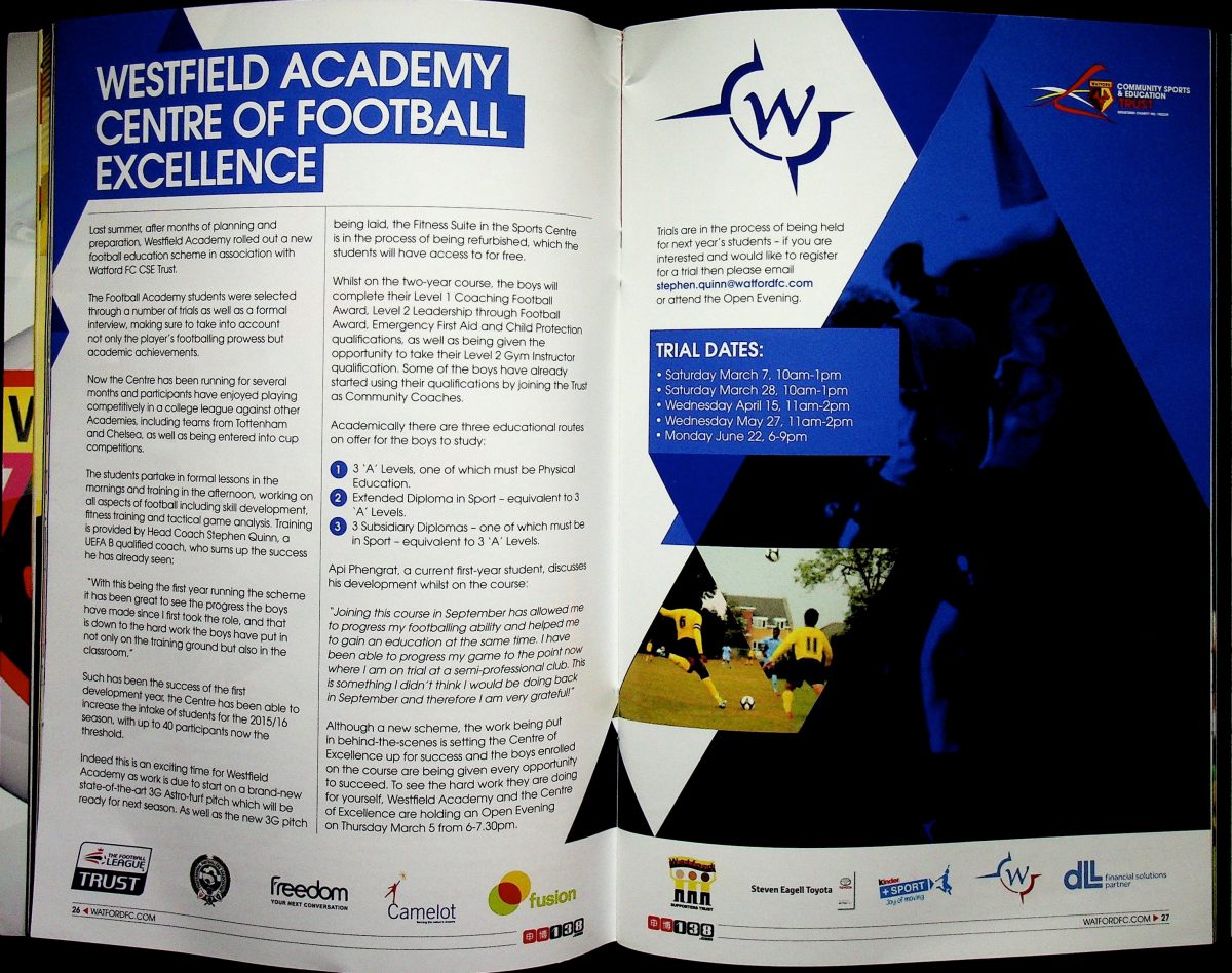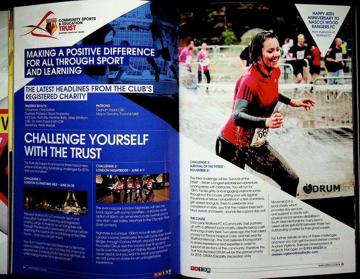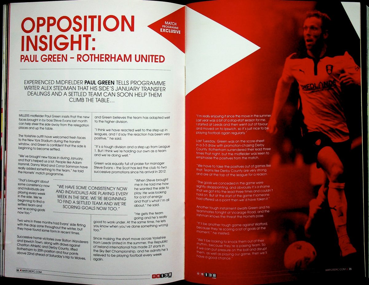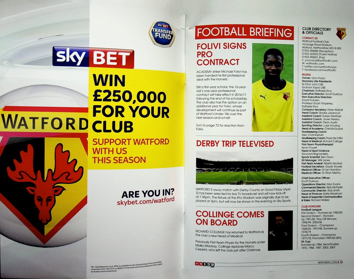 24th February 2015- Championship, Watford 3 Rotherham United 0 WFC.Net Goal Commentary: 1  2  3 BBC: Watford maintained their bid for automatic promotion as Odion Ighalo scored twice in a comprehensive win over struggling Rotherham. Sky: Odion Ighalo continued his superb run of scoring form with another two goals while strike partner Troy Deeney also netted as the Hornets remained six points behind leaders Derby. BHappy: So it was a curious game, except that curious makes it sound interesting and it really wasn’t that. It was curious in the sense that we’d done almost nothing to earn our half-time lead, basically just sitting in our own half and watching the enemy through binoculars until their sentry fell asleep. Aside from a Deeney snap-shot, our openings were entirely of Rotherham’s making, a defender falling over and a clearance rebounding back into the penalty area. We were set up to be a brick wall, albeit one which still managed to allow Arnason a completely free header from a corner for what should’ve been a prompt equaliser. That might’ve changed things. If you’re going to play a formation as miserable as this one, you’d really better not screw it up. As it was, the grumbling was mainly concentrated on the inability of either of our makeshift full-backs to take a proper throw-in. Fran’s Watford Blog: There was much complaining after the game because, convincing as the win had been, it was the dullest 3-0 imaginable. The way the team had been set up meant there was no width and little free-flowing football. Still a win is a win, the goal difference is improved and it is very tight at the top of the table. Sometimes dull is good. https://www.bbc.co.uk/sport/football/31498592 Share this: Share on X (Opens in new window) X Share on Facebook (Opens in new window) Facebook