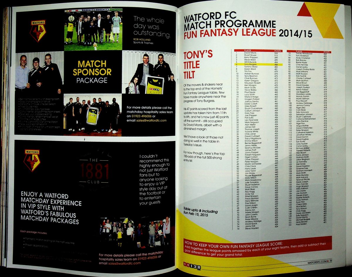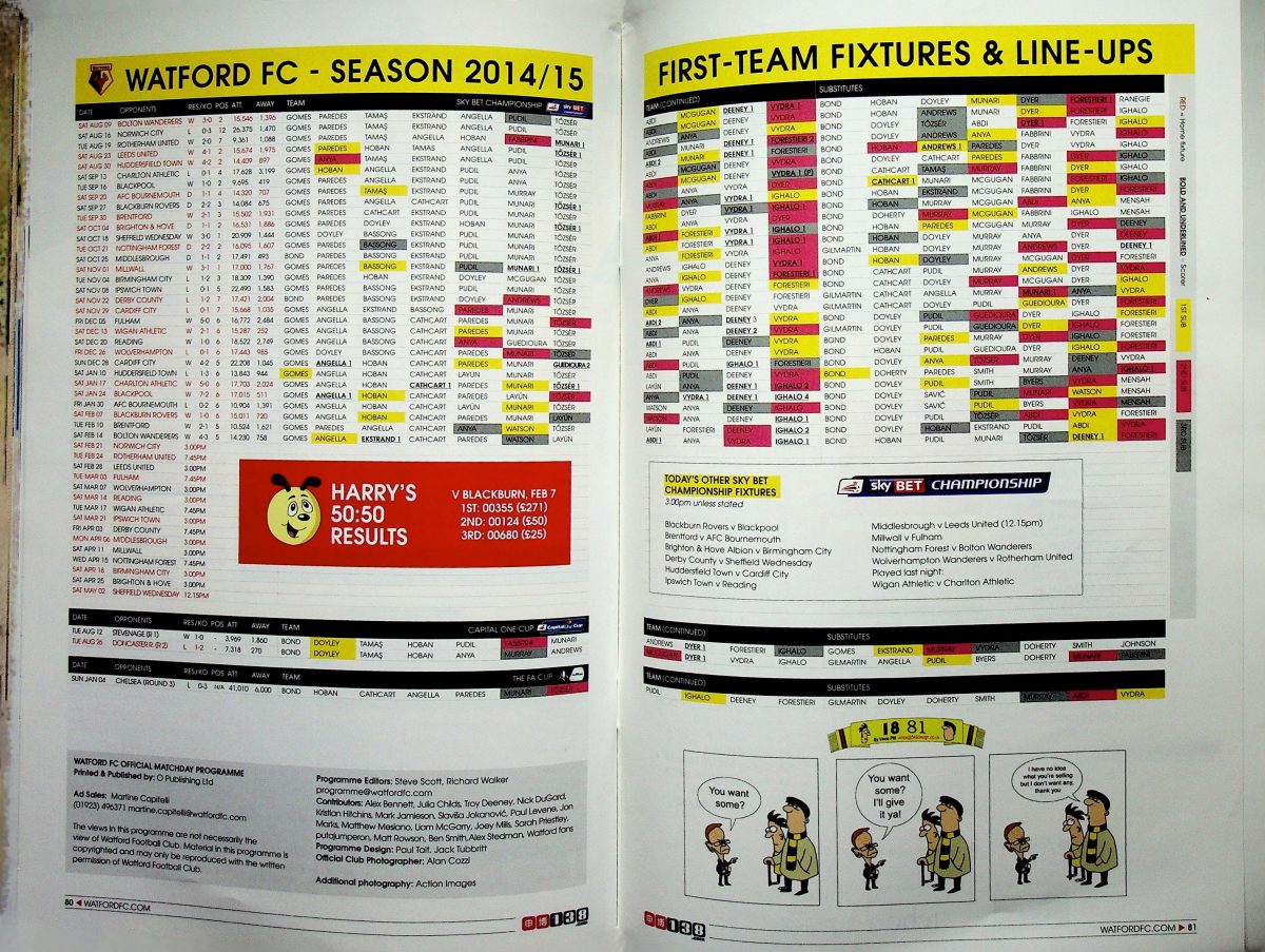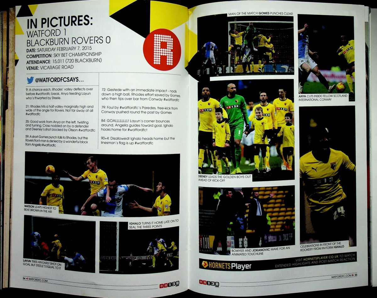 7th February 2015- Championship, Watford 1 Blackburn Rovers 0 WFC.Net goal commentary: 1 BBC: Watford striker Odion Ighalo scored his 12th goal of the season to give the Hornets victory over Blackburn. Sky: The Hornets had been marginally the better side in the first half, but they struggled against the visitors’ more direct approach after the break and needed goalkeeper Heurelho Gomes to stop them from going behind on at least two occasions. Bhappy: Blackburn dictated terms for long, long periods here, including the whole of a second half in which we barely created as much as a half-chance and, I suspect, mustered no more than one vital, decisive shot on goal. They set the agenda, they shaped the game, they’ll feel with complete justification that they should’ve won it. They were well-organised, robust and physical, and a bit charmless in a way that I find oddly charming; these kind of Championship gurners are gradually dying out, and more’s the pity. In Chris Brown, they had a proper old-fashioned villain of a centre forward, all bad-temper and elbows, whose only failure in the service of his side was to miss the couple of chances that came his way. In Jay Spearing, whose resemblance to one of the boulder-trolls from Frozen is uncanny, they had a proper midfield hatchet man, treading the kind of disciplinary tightrope that any midfielder worth his salt ought to spend his career walking. The rest aren’t exactly shrinking violets. There’s something Victorian and industrial about them, and I’ll regret the day when our legion of continental fancy-dans doesn’t have to overcome this kind of challenge. They’re a good side. Not a nice one, but a good one. Fran’s Watford Blog: In a rare Watford attack, Vydra exchanged passes with Deeney and tried a shot that was blocked, it fell to Paredes who played it out to Deeney whose shot was put out for a corner. Watford then took an unexpected lead as Layun’s set piece was played on by Angella to Ighalo whose shot found the net by way of Steele’s hand and the post. The celebration of this miracle included a very long prayer from the goalscorer. Blackburn tried to hit back and there was a moment of drama as Gomes punched a cross then chased the ball out of the box to welly it over the SEJ stand to loud cheers from the Watford faithful. Watford appeared to have increased their lead in the final moments as Vydra and Ighalo broke forward and the Czech won a corner from which a cross was headed home by a defender as Ighalo challenged, but the goal was ruled out for offside presumably as Ighalo was deemed to be interfering with play. There were huge cheers at the final whistle. It had been a difficult game and the win was hardly deserved, but Blackburn had been such unpleasant opponents that I felt no guilt. It was no surprise that Gomes won the man of the match award and he was given a tremendous ovation as he did his lap of the pitch applauding the crowd at the end. https://www.bbc.co.uk/sport/football/31070467 Share this: Share on X (Opens in new window) X Share on Facebook (Opens in new window) Facebook