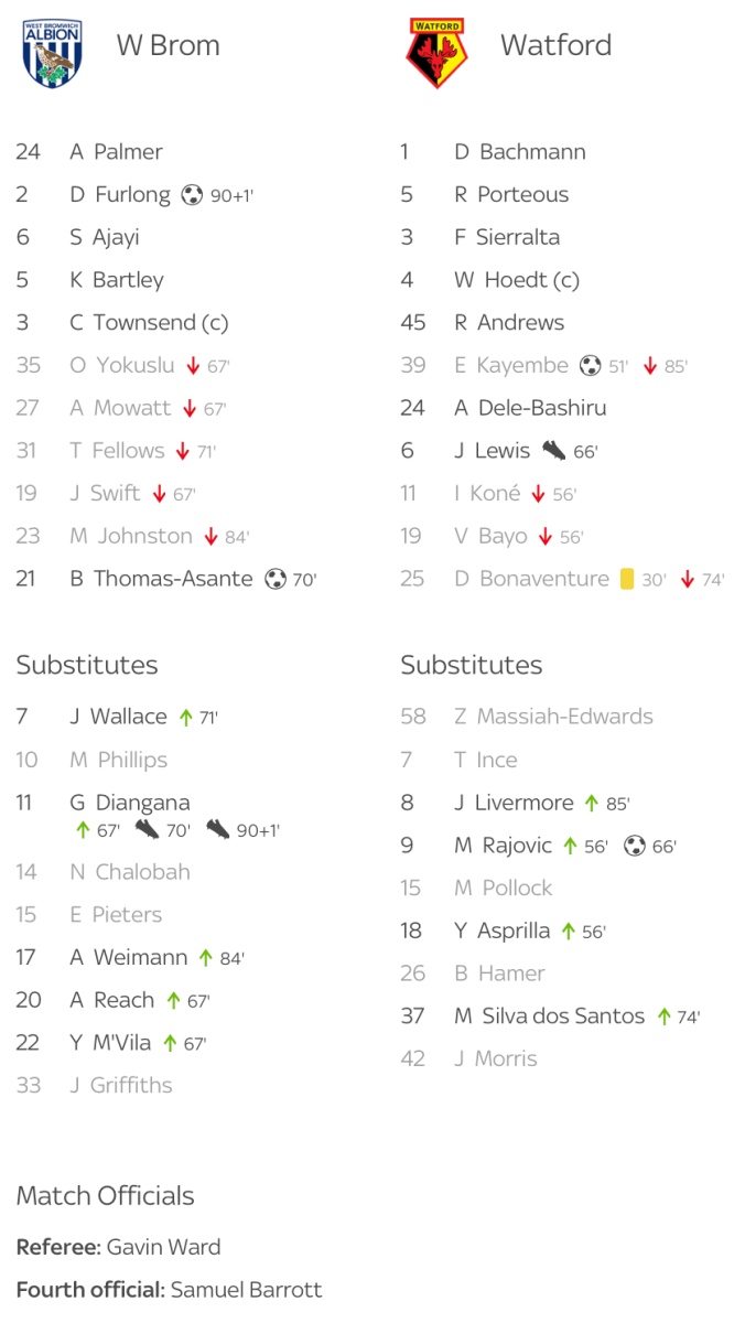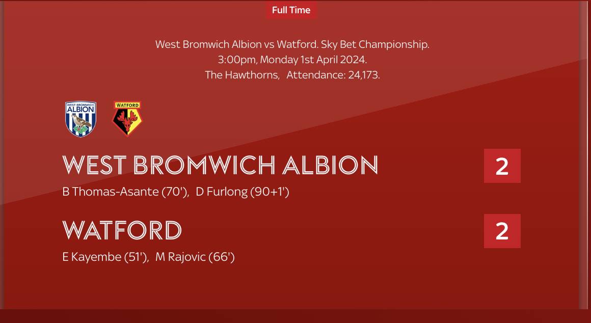 1st April 2024- Championship, West Bromwich Albion 2 Watford 2 WFC.Net goal commentary: 1 2 Sky: Darnell Furlong scored a dramatic late equaliser for West Brom as they took another point in their efforts to secure a Sky Bet Championship play-off spot with a hard-fought 2-2 home draw against Watford. BBC: Second-half strikes from Edo Kayembe and Mileta Rajovic put the Hornets in control. Brandon Thomas-Asante halved the deficit with an angled shot, and Darnell Furlong’s piledriver in added time completed an impressive comeback by the Baggies. Watford Observer: Late equaliser doesn’t hide another step forward for Watford Watford boss felt only two points from Easter was harsh Cleverley says Watford changes in attack helped team defend BHappy: A word for Mileta Rajović, who got a proper run here for the first time in Tom’s three games to date. I’ve been fooled by suggestions like this before that haven’t been followed through in subsequent games, so let’s see but… one of the frustrations with the big striker has been his reluctance, perhaps inability to weaponise his size. He grapples, he competes, though his total lack of acceleration makes him less of a nuisance than he might be… but he’s not shown enough evidence of an ability to bully opponents. He bullied West Brom here. His forty minutes or so was aggressive and effective… somehow he no longer seemed to be lumbering slightly haplessly after the game but was very much at the centre of it. Competing for headers he had little chance of winning but leaving something on his marker anyway, just to let him know he had a scrap on his hands. Pushing away challenges and spreading the play as teammates scampered away from him. Bellowing at Emmanuel Dennis’ selfishness (yes, really) as the Nigerian picked up the pieces after Palmer had pushed away a TDB drive and smacked a shot against the post from a ridiculous angle rather than pulling back for the Dane to tap in. Arguing with fellow sub Martins, claiming rights to a free kick won on the edge of the area… Martins prevailed and curled a shot gently into the keeper’s chest, a Rajović set piece would have been morbidly fascinating. Finally, flying in at the far post to stretch and turn in yet another Lewis cross; the celebration was in front of the away section and screamed both joy and relief. We screamed with him, a fine moment irrespective of what happened subsequently. Fran’s Watford Blog: After the final whistle, Hoedt led the players over to applaud us while ruefully shaking his head. The travelling faithful gave the players a really good reception and Cleverley was greeted with a loud chorus of his name. https://www.bbc.com/sport/football/68652949 Share this: Share on X (Opens in new window) X Share on Facebook (Opens in new window) Facebook