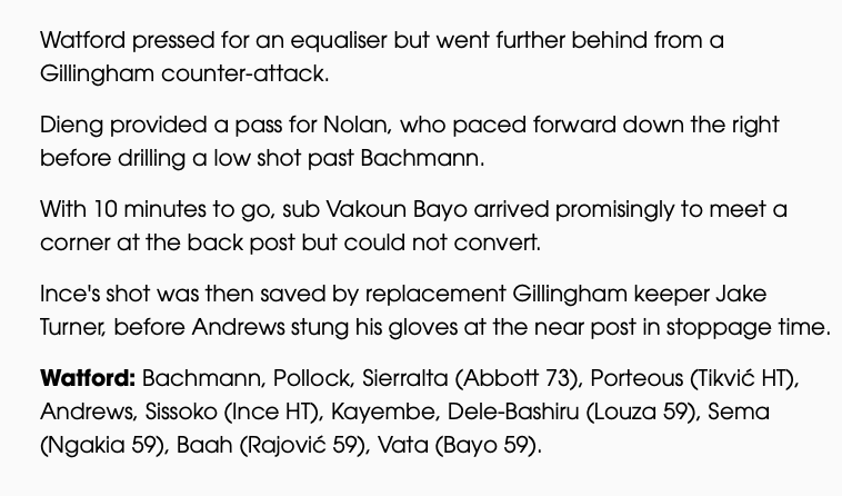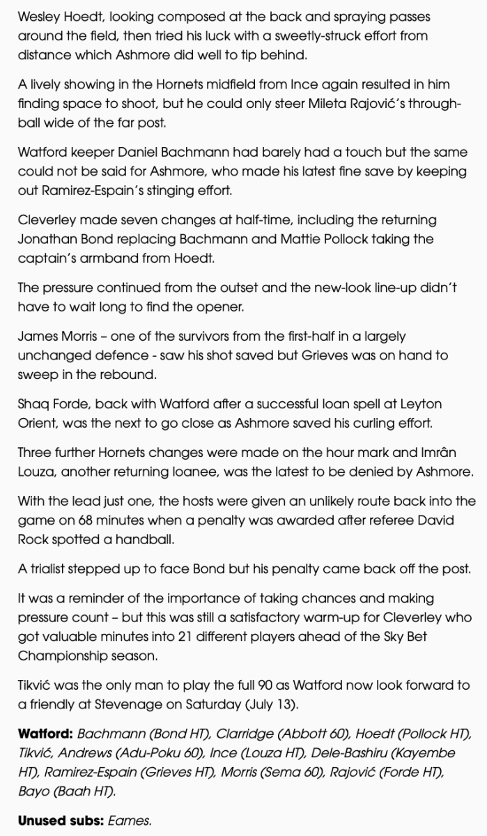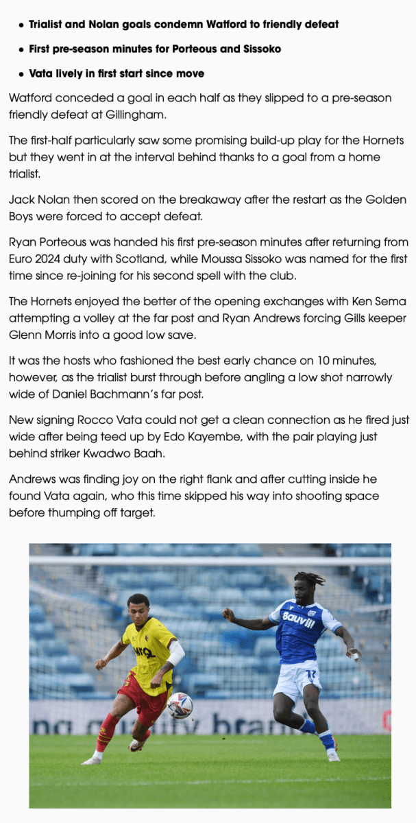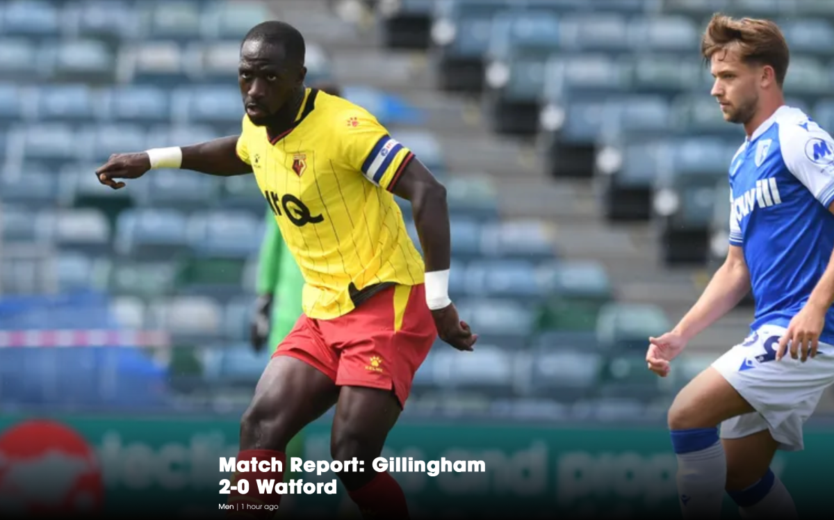 20th July 2024- Friendly, Gillingham 2 Watford 0 Match Report: Gillingham 2-0 Watford – Watford FCDownload Reaction: Cleverley On Gillingham & Players Update Watford Observer: Watford suffer 2-0 defeat at Gillingham in pre-season friendly Gillingham FC website report Share this: Click to share on X (Opens in new window) X Click to share on Facebook (Opens in new window) Facebook