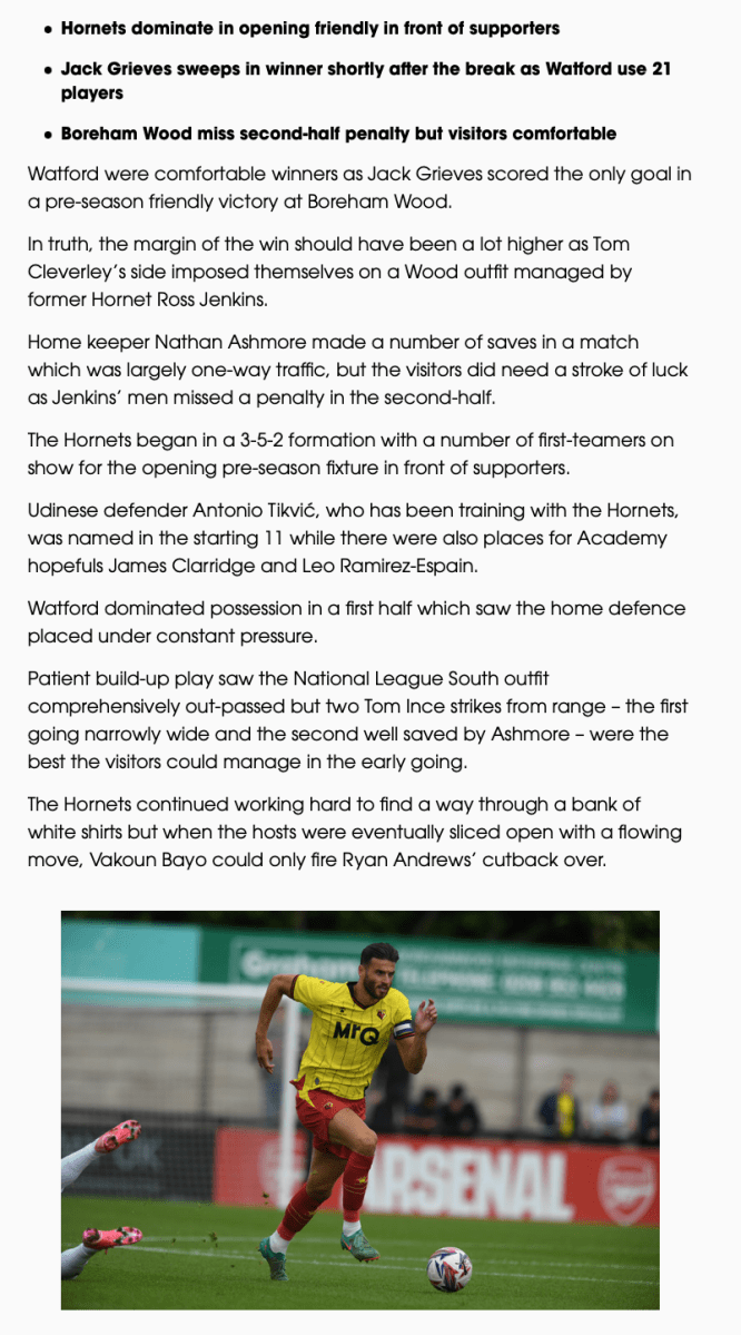 10th July 2024- Friendly, Boreham Wood 0 Watford 1 Match Report: Boreham Wood 0-1 Watford – Watford FC.htmlDownload Watford Observer live blog Boreham Wood FC report Share this: Click to share on X (Opens in new window) X Click to share on Facebook (Opens in new window) Facebook