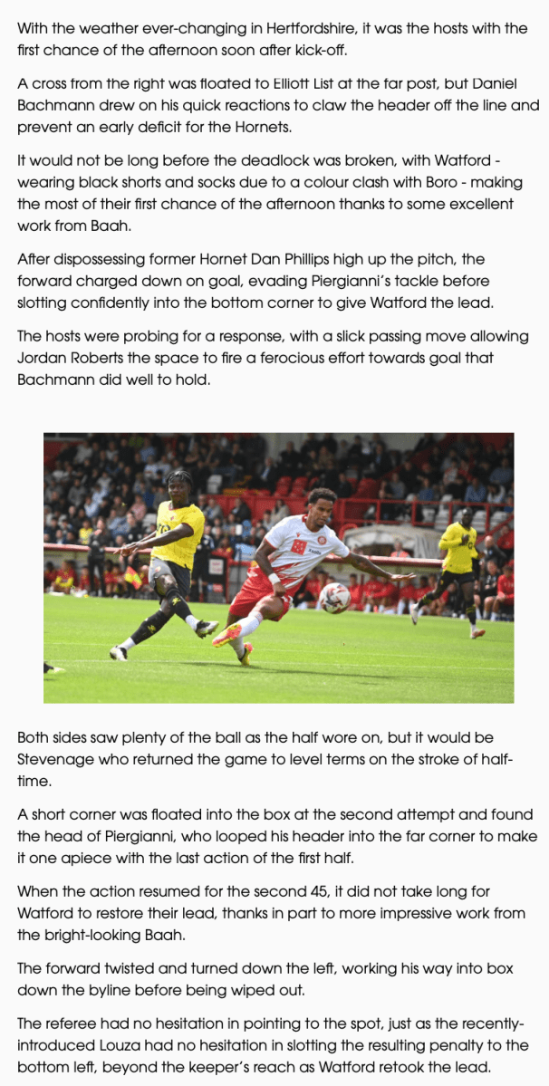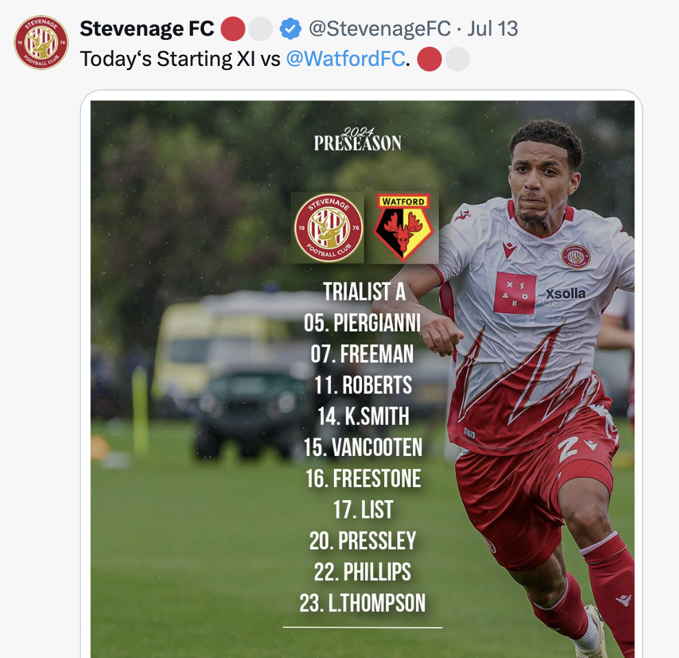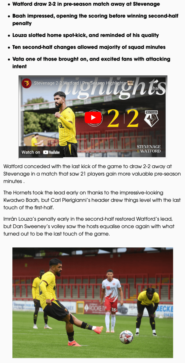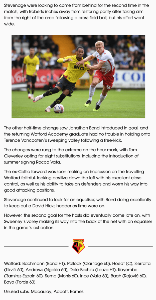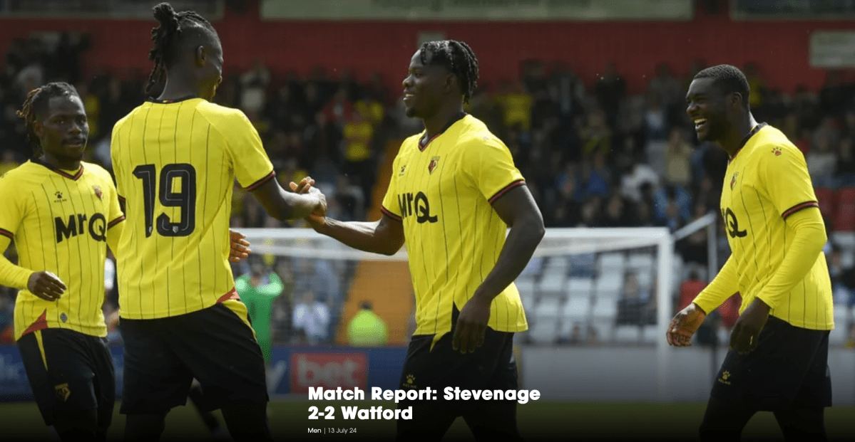 13th July 2024- Friendly, Stevenage 2 Watford 2 Match Report: Stevenage 2-2 Watford – Watford FC.htmlDownload Watford Observer live blog Stevenage FC report Attendance: 1966 (813 away fans) Share this: Click to share on X (Opens in new window) X Click to share on Facebook (Opens in new window) Facebook