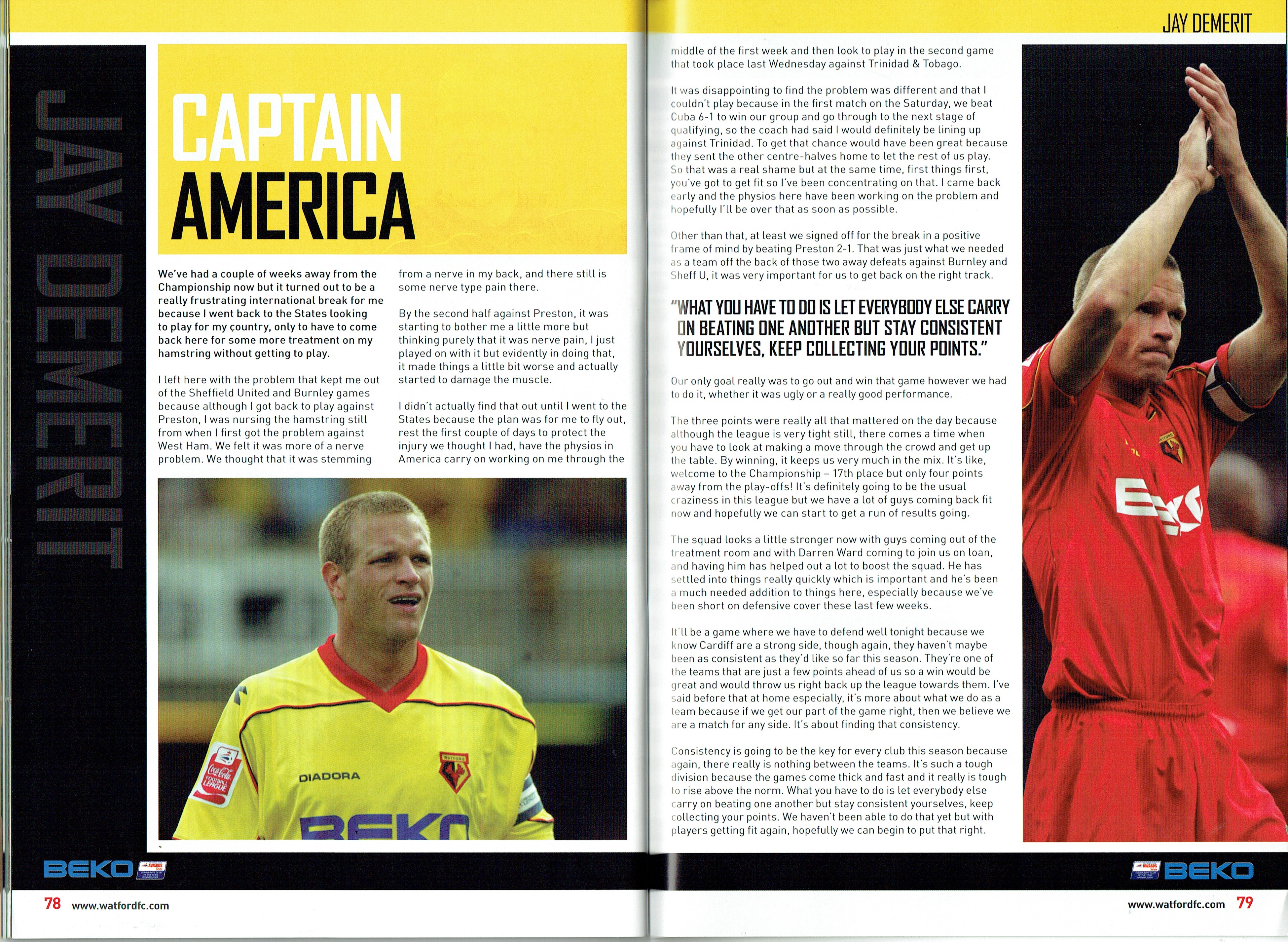 21st October 2008- Championship, Watford 2 Cardiff City 2 Leave a Reply Jay Bothroyd tripled his goal tally for the season to rescue a point for Cardiff away to 10-man Watford. The Hornets stormed into a two goal lead thanks to efforts from John-Joe O’Toole and Will Hoskins, before Tamas Priskin was sent off for violent conduct. Let’s get it out of the way, then: Tamas, you’re a blithering idiot. Just at the point where you’d started to think that, with Will Hoskins guiding the midfield into the opposition’s vulnerable areas quite brilliantly, we could really do some damage on the break as Cardiff pressed forward. Just at the point where you’ve scored a couple of goals and given your Watford career some desperately-needed momentum. Just at the point where your rival is returning from injury. You have blancmange for brains, sir. http://watford.fcdb.info?s=32572&id=4828 Share this: Share on X (Opens in new window) X Share on Facebook (Opens in new window) Facebook