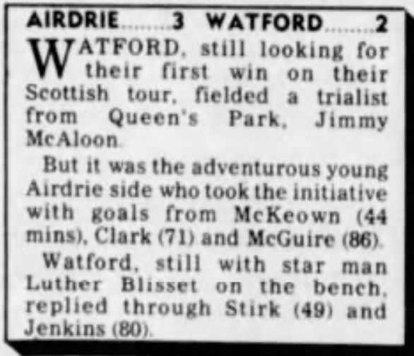3rd August 1978- Friendly, Airdrieonians 1 Watford 3 https://www.watfordfcarchive.co.uk/fixture/1978-08-03 Watford Observer match report Share this: Share on X (Opens in new window) X Share on Facebook (Opens in new window) Facebook